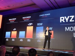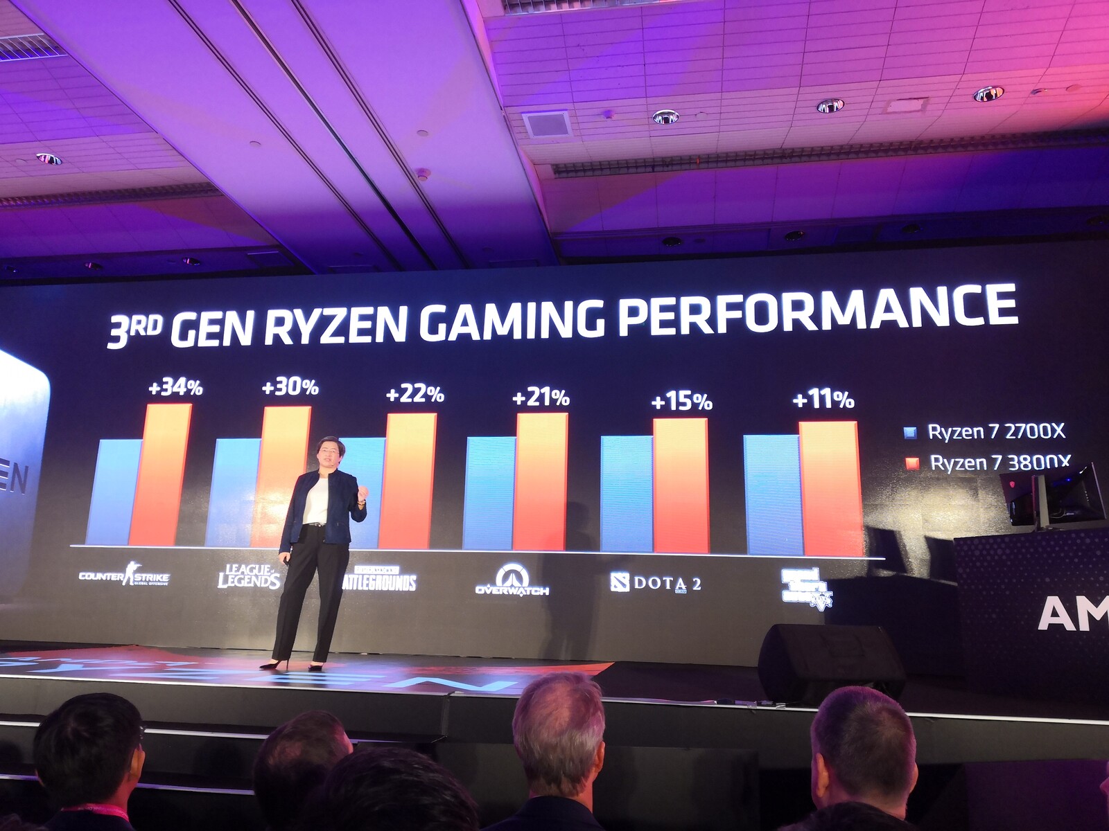 In der Pressekonferenz führte Dr. Lisa Su drei ausgewählte Prozessoren der neuen Ryzen-3000-Serie vor. Die AMD Ryzen 7 3700X (8 Kerne/16 Threads, 4,4 GHz Boost, 3,6 GHz Baseclock, 36 MB Cache) wurde etwa gegen die Intel i7-9700K im Cinebench R20-Test ins Rennen geschickt (8 vs. 8-Core) und kann dort einen Vorsprung von 28% im Multi-Thread-Test einfahren während man bei der Single-Thread-Performance auf gleichem Level mit Intel bleibt. Dabei weist die 3700X eine erheblich niedrigere TDP von 65 Watt auf (vs. 95 Watt für die 9700K). Die Vorteile der fortgeschrittenen 7-nm-Fertigung (Intel: 14 Nanometer) werden eindrucksvoll sichtbar.