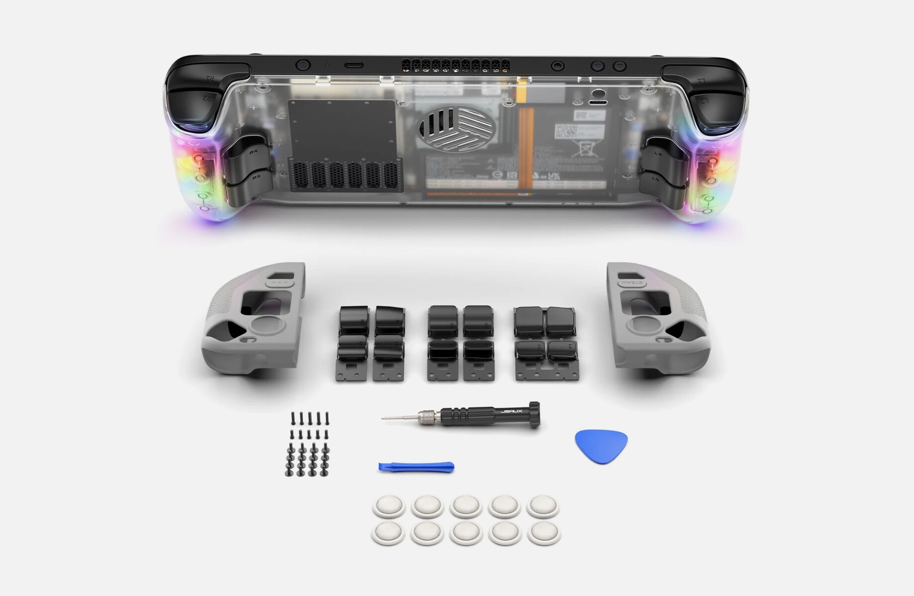 Zeitgleich präsentiert Jsaux eine transparente Rückseite für das Steam Deck. Diese erlaubt es nicht nur, das Innenleben des Gaming-Handhelds zu sehen, zusätzliche Lüftungsöffnungen sollen für niedrigere Temperaturen sorgen. Die RGB-Beleuchtung sitzt direkt in den beiden Handgriffen des Handhelds. Jsaux liefert Silikon-Handgriffe sowie rückseitige Trigger in unterschiedlicher Höhe mit, neben einem Schraubendreher und zehn Ersatzschrauben.