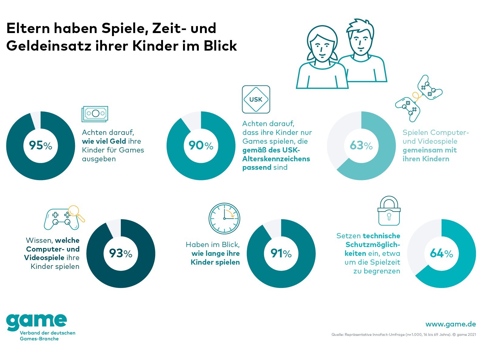 In der Umfrage sagen 93 Prozent der Eltern, dass sie den Überblick haben, welche Computer- und Video-Games ihre Kinder spielen. Auch die Spielzeit und wie viel Geld für Computer- und Videospiele ausgegeben wird haben die Eltern immer auf dem Schirm: 95 Prozent der Eltern achten penibel darauf, wie viel Geld ihre Kinder für Games ausgeben und 91 Prozent, wie lange diese spielen.