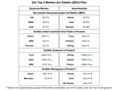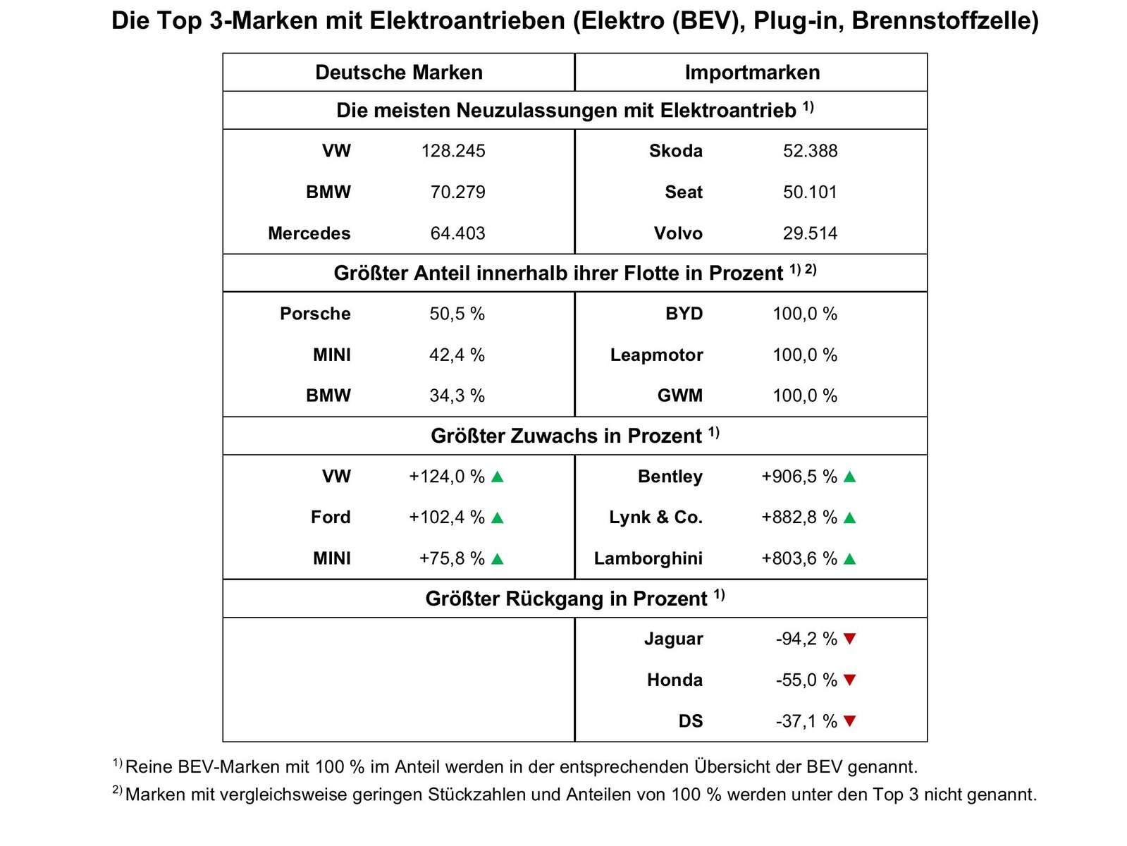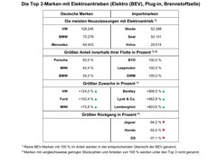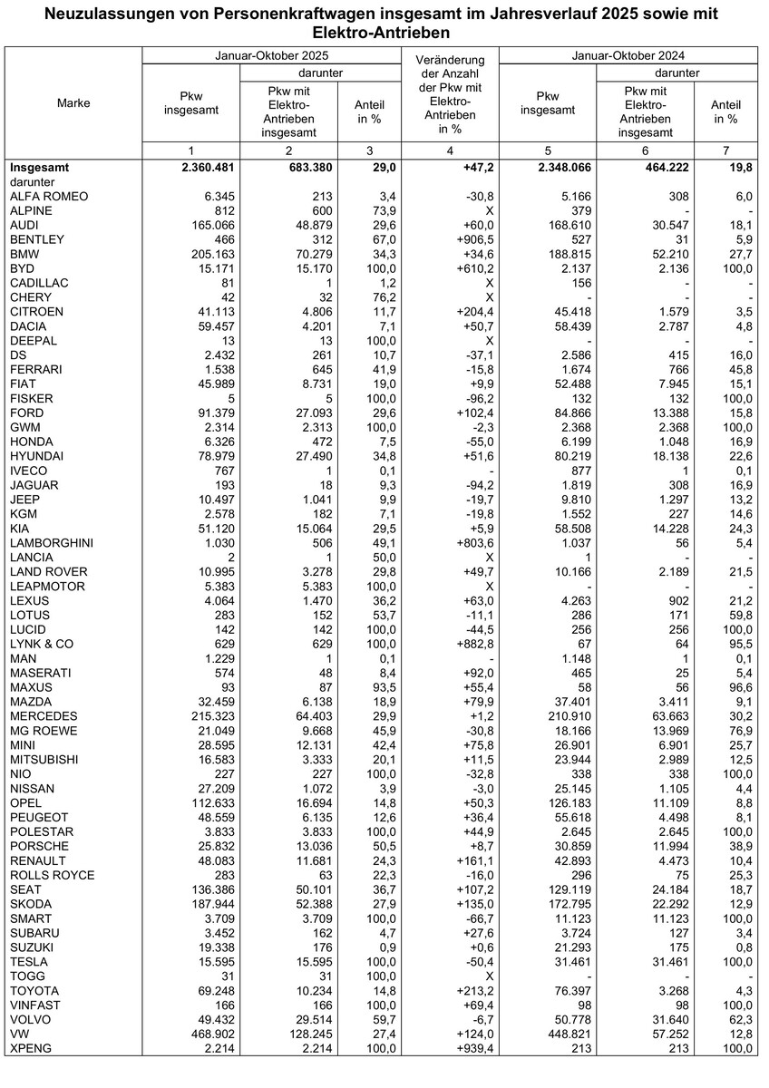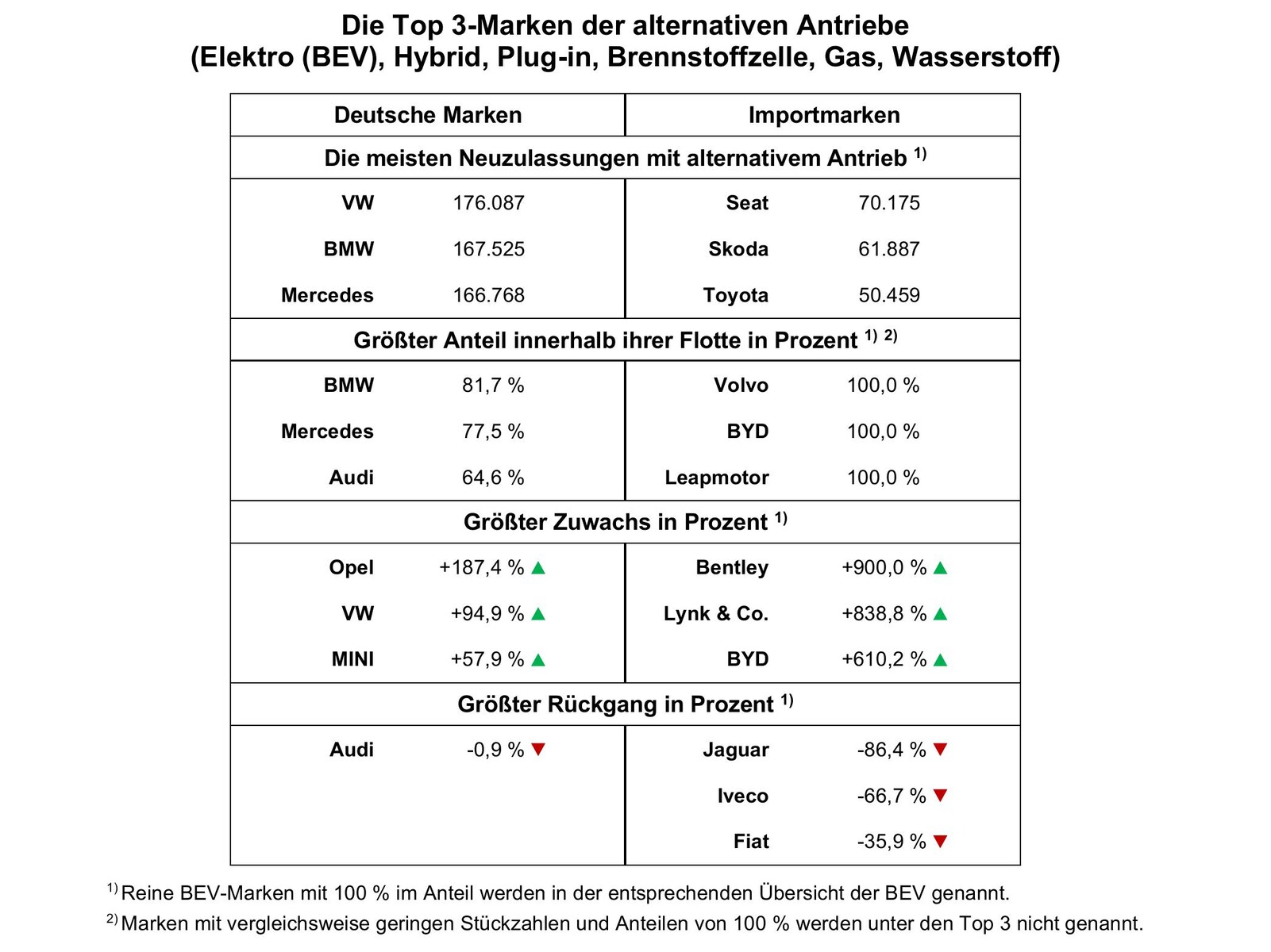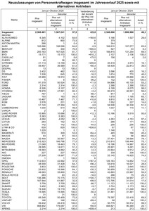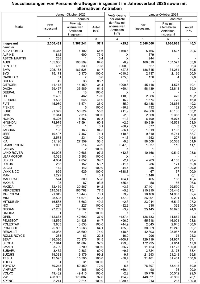 Fasst man die Gruppe der Fahrzeuge mit Elektroantrieb zusammen (BEV, Plug-in-Hybrid und Brennstoffzelle), so wurden in Deutschland bis Oktober 683.380 Neuwagen registriert. Das ist ein Plus von 47,2 Prozent. Rechnet man die reinen Stromer heraus, entfallen knapp 250.000 Zulassungen auf Plug-in-Hybride und die wenigen Brennstoffzellen-Fahrzeuge. Auch in dieser Gesamtwertung dominiert VW mit 128.245 Fahrzeugen (+124 Prozent). BMW folgt mit 70.279 Einheiten (+34,6 Prozent) auf Platz zwei, noch vor Mercedes-Benz mit 64.403 Fahrzeugen (+1,2 Prozent). Besonders stark performte Seat im Bereich der elektrifizierten Antriebe mit einem Zuwachs von 107 Prozent auf über 50.000 Fahrzeuge. Die Kategorie der "alternativen Antriebe" insgesamt, die vom KBA auch einfache Hybride und Gas-Fahrzeuge umfasst, macht mit 1.367.241 Einheiten inzwischen 57,9 Prozent des Gesamtmarktes aus, der bei 2,36 Millionen Pkw liegt.