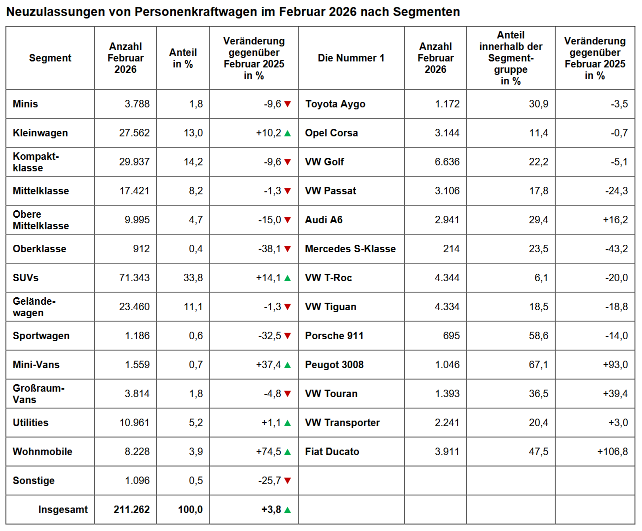 Schaut man auf die traditionellen Klassen, zeigt sich eine massive VW-Präsenz. Der Golf führt die Kompaktklasse mit 6.636 Neuzulassungen und 22,2 Prozent Segmentanteil an. Der Passat dominiert bei den Mittelklasse-Käufern und der T-Roc im riesigen SUV-Segment. Doch Marken wie Opel brechen diese Wand auf: Bei den Kleinwagen fährt der Opel Corsa mit 3.144 Zulassungen allen davon. Ausreißer nach oben gibt es auch ganz unten: Bei den kleinsten Autos, dem Segment Mini, drängte sich der Toyota Aygo mit knapp 31 Prozent Marktanteil frisch an die Spitze und verdrängte die Vormonats-Konkurrenz.