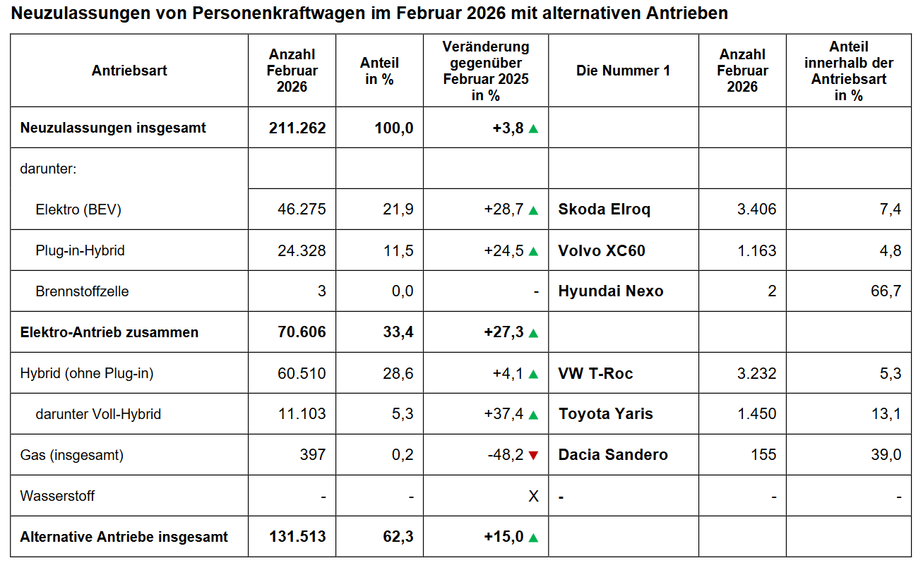 Die detaillierte Neuzulassungsstatistik für den Gesamtmarkt wird das KBA laut Mitteilung erst in Kürze nachreichen. Die vorab veröffentlichten Eckdaten belegen jedoch das enorme Wachstum der Elektromobilität. Mit insgesamt 46.275 Neuzulassungen legten reine Elektroautos im Februar um 28,7 Prozent gegenüber dem Vorjahr zu. Alternative Antriebe kamen insgesamt auf 131.513 Einheiten, was einem satten Plus von 15 Prozent entspricht.