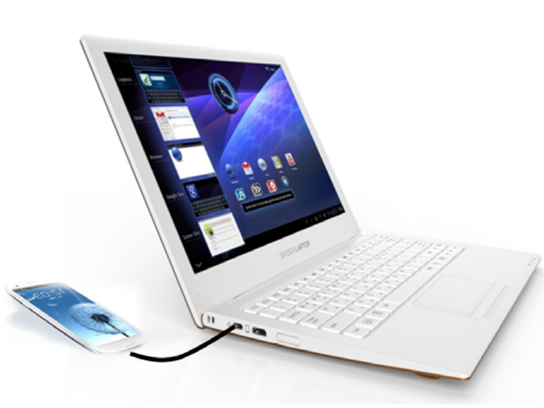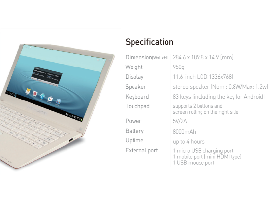 Das neue KT Spider Laptop als Basisstation für das Galaxy S3 misst 284,6 x 189,8 x 14,9 Millimeter und bringt 0,95 Kilogramm auf die Waage. An Bord des KT Spider Laptops finden sich ein 11,6"-Display mit 1.366 x 768 Pixeln, eine Tastatur mit 83 Tasten, Stereolautsprecher, ein 8.000-mAh-Akku, 1x micro-USB, 1x mini-HDMI und ein USB-Port für Peripherie. Als Preis für das KT Spider Laptop nennt KT 297.000 Won, umgerechnet rund 210 Euro.