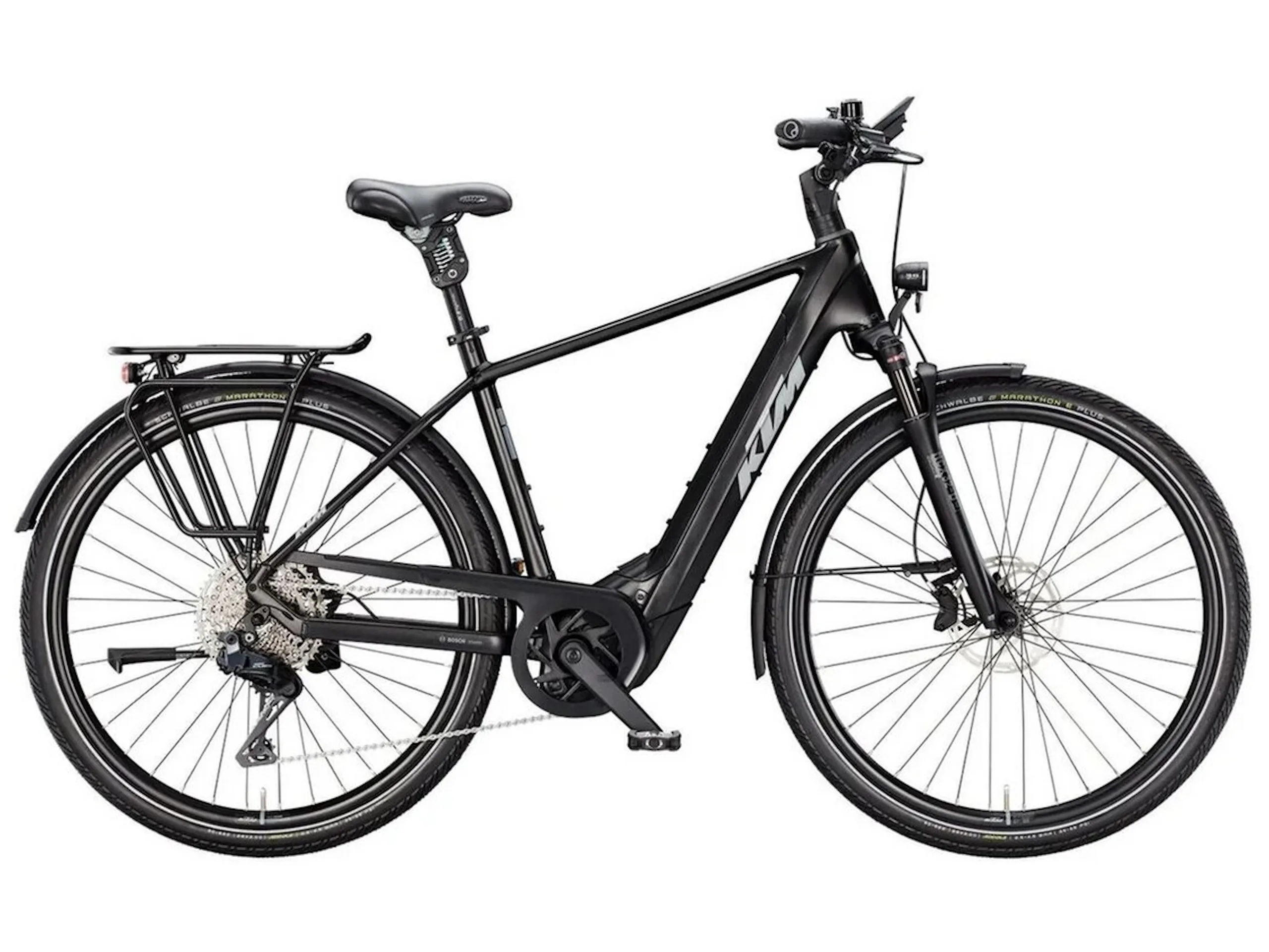 Für ein Trekking-E-Bike ganz typisch: Eine Federgabel ist verbaut, dabei bietet diesen einen Federweg von 63 Millimetern. Die bySchulz-Sattelstütze ist ebenfalls gefedert. Genutzt wird ein Bosch Performance CX-Mittelmotor mit einem maximalen Drehmoment von 100 Nm (mit Update), der Bosch PowerTube-Akku bietet eine Kapazität von 800 Wh, die Akkukapazität lässt sich noch mit einem PowerMore-Akku um 250 Wh erhöhen.