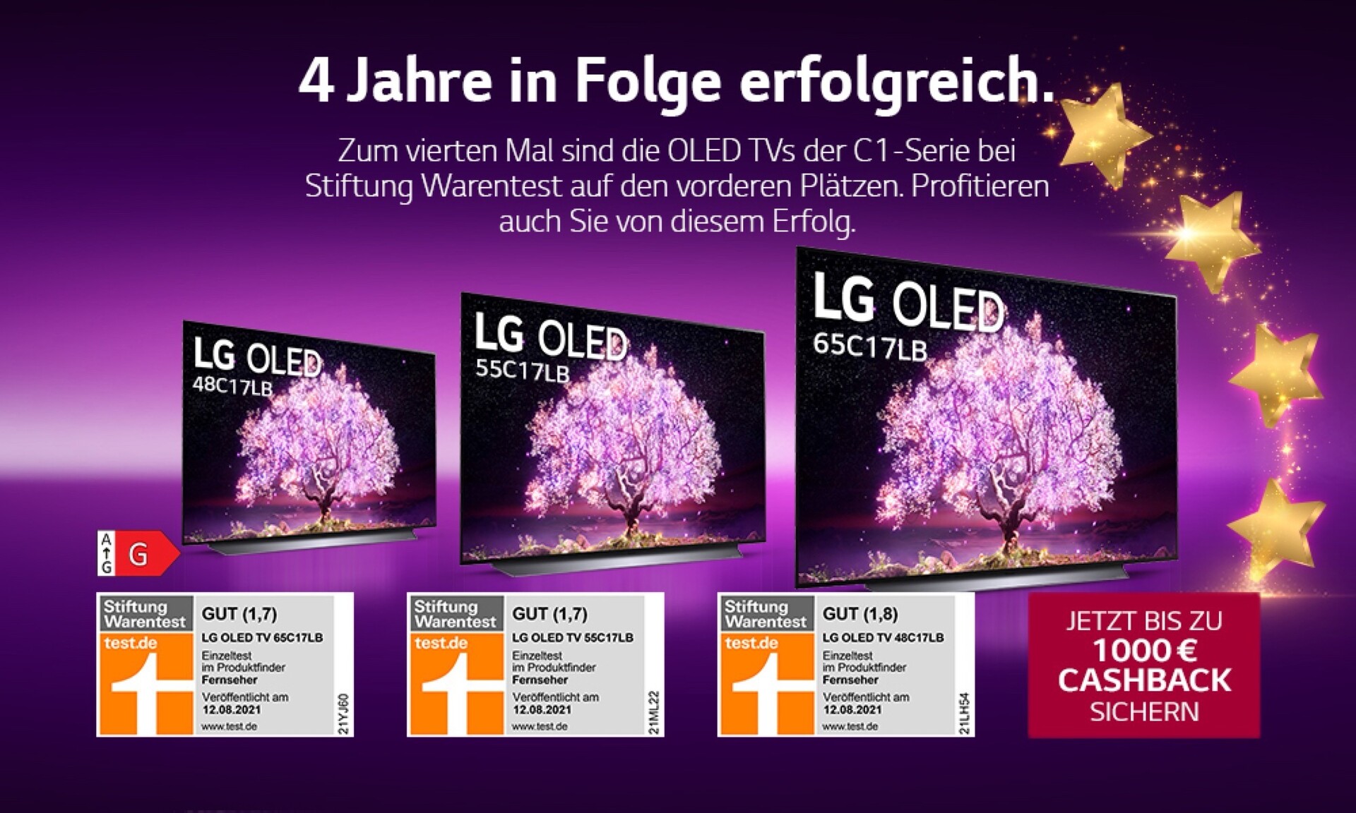 LG hat eine neue Aktion gestartet, die es erlaubt, einen Fernseher bei einem beliebigen Händler zu kaufen und diesen anschließend beim Hersteller zu registrieren, um Geld zurück zu erhalten. Die Aktion erlaubt maximal eine Rückzahlung von 1.000 Euro, den vollen Betrag erhalten aber nur Käufer des 83 Zoll großen LG OLED83C17LA, der rund 5.300 Euro kostet.