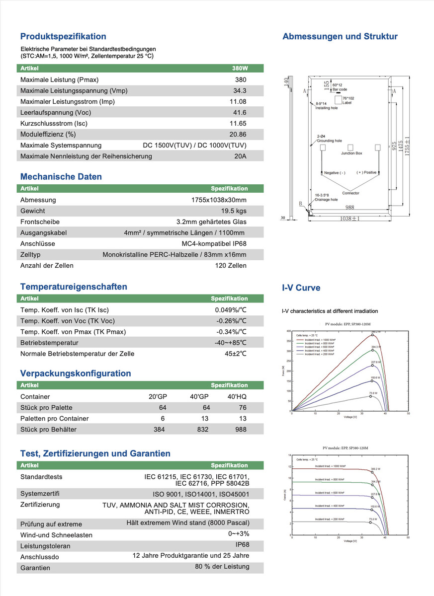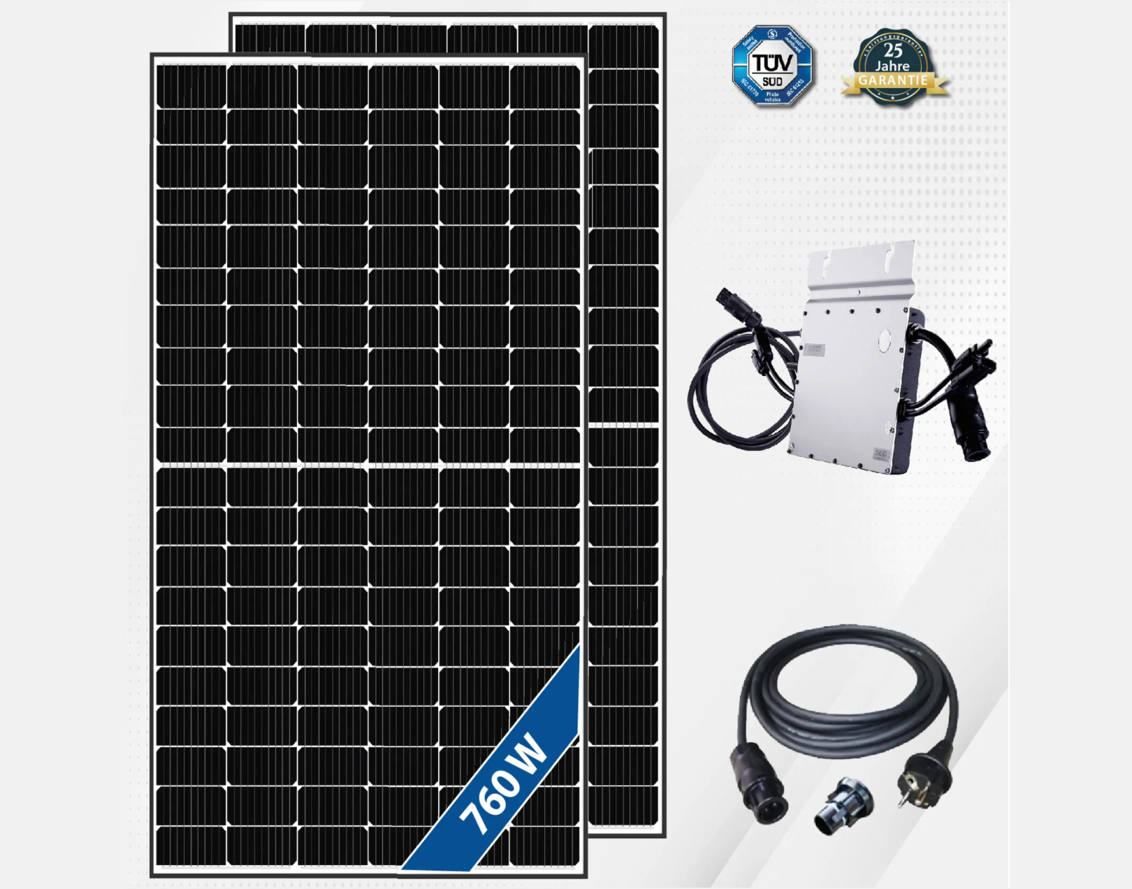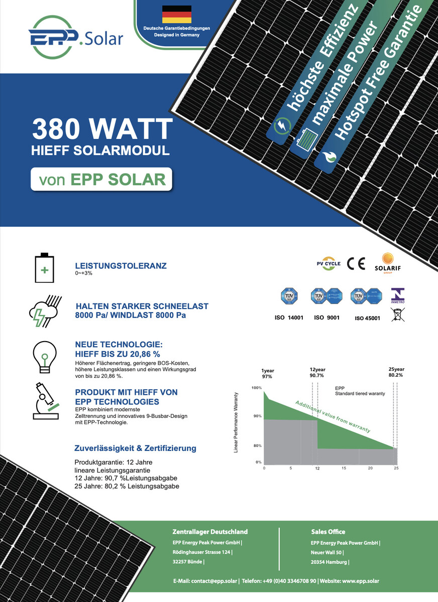 Das Balkonkraftwerk ist mit zwei monokristallinen Solarmodulen Hieff EPP-380W-B von EPP Solar mit schwarzen Rahmen und einer Leistung von je 380 Wp ausgestattet. Die Frontscheibe aus gehärtetem Glas mit Antireflexbeschichtung soll auch bei starkem Wind (bis 2.400 Pa) und hohen Schneelasten (5.400 Pa) für ausreichende Stabilität sorgen.
