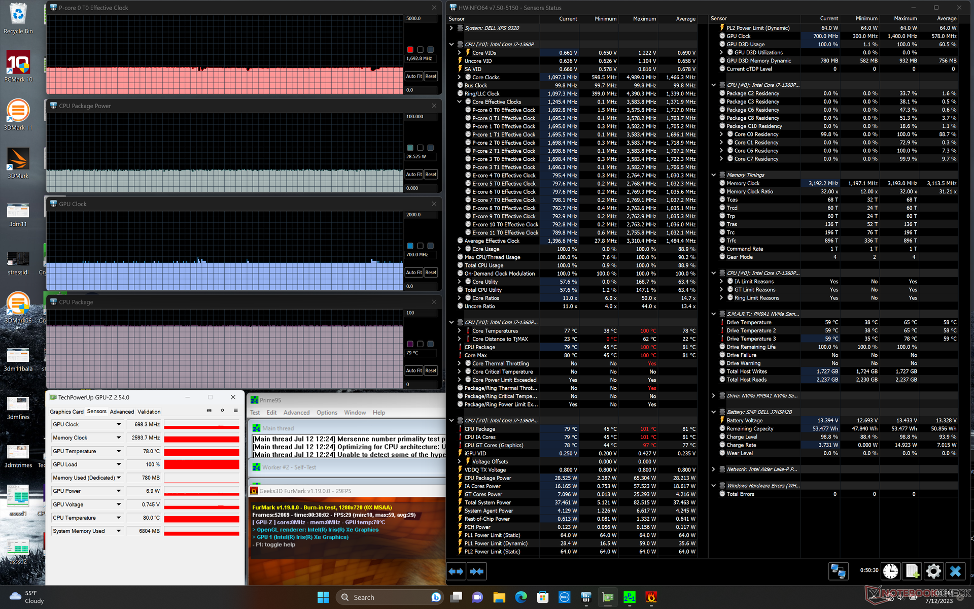 Unter Dauerlast in Prime95 liegen die PL2 und PL1-Limits des Core i7-1360P bei 64 und 34 Watt und damit genauso hoch wie beim Core i7-1280P im letztjährigen XPS 13 Plus. Die Taktrate beträgt in der Spitze 3,6 GHz, danach wird auf 2,3 GHz bei 90 Grad Celsius heruntergetaktet. Die sehr hohen CPU-Temperaturen sind wohl teilweise für die oben thematisierten Oberflächentemperaturen verantwortlich.