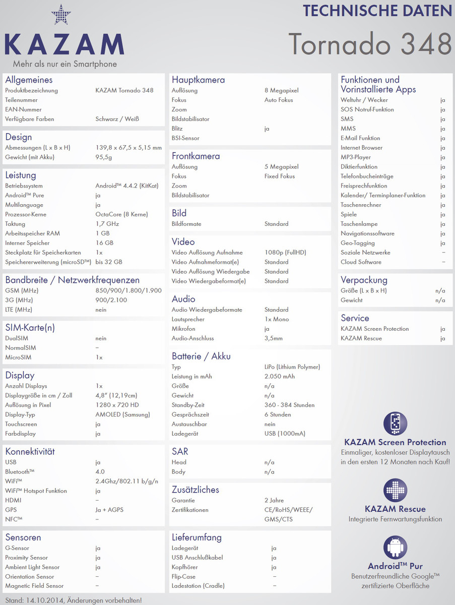 Zwei integrierte Smartphone-Kameras (8 MP hinten, 5 MP vorne), Bluetooth 4.0, WLAN 802.11 b/g/n und ein 2050-mAh-Akku, der für eine Standby-Zeit von bis zu 384 Stunden reichen soll, runden die Ausstattung des Kazam Tornado 348 ab. Als OS läuft Googles Android 4.4.2 KitKat. Hier finden sie weitere Details zum Gionee Elife S5.1.