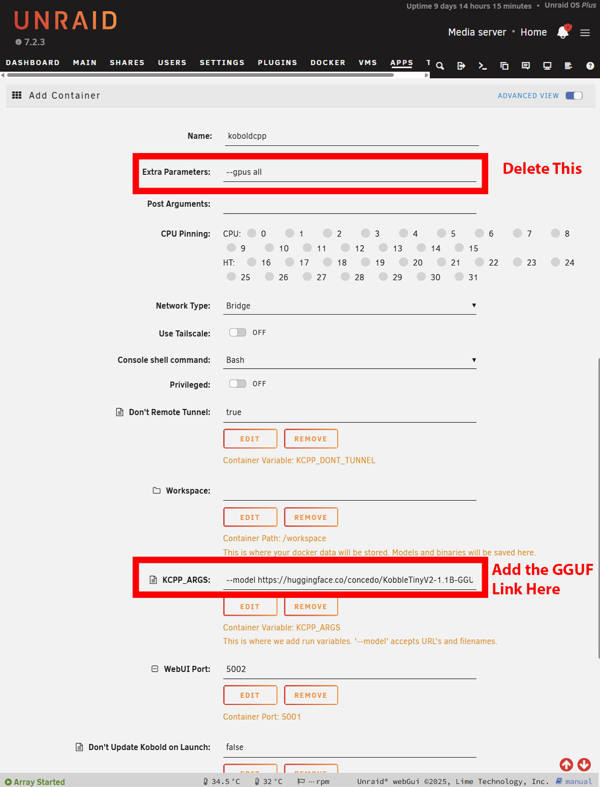 Die Installation unter Windows läuft weitgehend genauso ab. Wird das Modell ohne GPU genutzt, muss allerdings die NoCUDA-Version heruntergeladen werden. Der Start kann etwas dauern, da KoboldCPP zunächst das Modell herunterlädt, bevor die Benutzeroberfläche angezeigt wird. Unter Windows ist das gut erkennbar, bei Unraid oder TrueNAS muss dagegen das Log geöffnet werden, um den Download-Fortschritt zu sehen. Unter Unraid kann es zudem nötig sein, den verfügbaren Speicherplatz für Docker-Container zu erhöhen – je nachdem, wie groß das gewählte Modell ist.