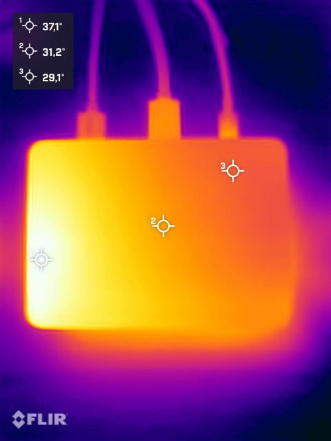 (±) Auf der Unterseite messen wir eine maximalen Wert von 42.5 °C (im Vergleich zum Durchschnitt von 36.3 °C).