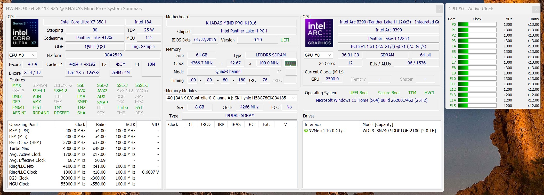 | Khadas Mind Pro Intel Core Ultra X7 358H ⎘ Intel Arc B390 12 Xe3 Panther Lake iGPU ⎘ 64 GB RAM, 2048 GB SSD | Amazon: 1. 1.799,00 € khadas Mind 2s AI Mini PC - ... 2. 1.490,00 € khadas Mind 2 Mini PC - Inte... 3. 152,79 € Khadas Mind Dock for Mind Er... Listenpreis: 1799€ | 566 g | 105 x 146 x 58 mm | |