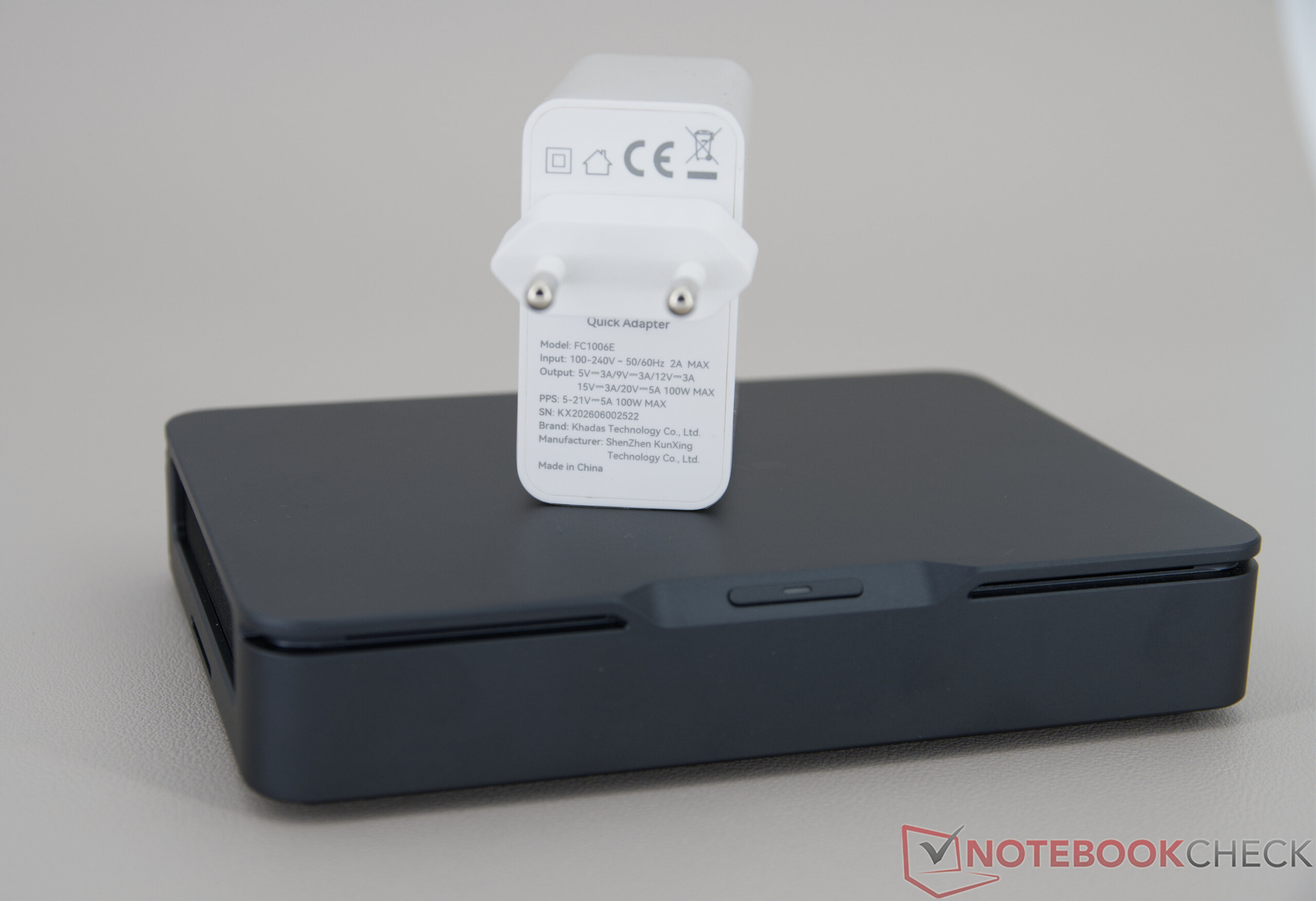Der Khadas Mind Pro wird mit einem 100-Watt-Netzteil ausgeliefert, das ausreichend Reserven für das leistungsstärkere System bietet. Im Leerlauf bewegt sich der Stromverbrauch je nach Lastzustand im Bereich von etwa 6,7 bis 11,5 Watt, während unter Belastung durchschnittlich rund 53 Watt gemessen werden. Kurzzeitig kann der Verbrauch auf bis zu rund 64,4 Watt ansteigen, was für das Netzteil jedoch keinerlei Herausforderung darstellt. Insgesamt präsentiert sich der Mini-PC im Test als äußerst effizient und kann sich im Vergleich vor allen Vergleichsgeräten positionieren.