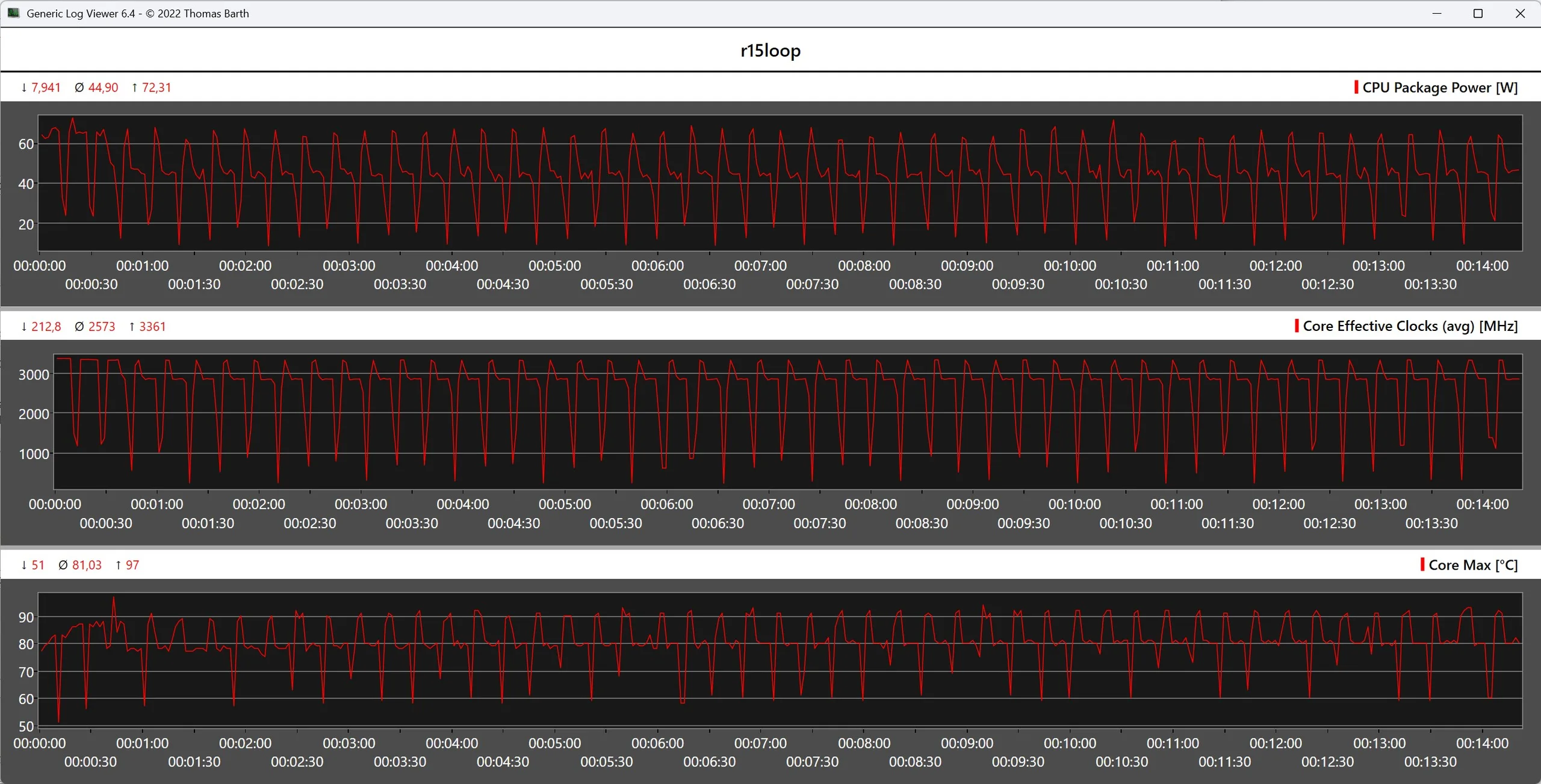 Unter anhaltender Last sinkt die Leistung des Intel Core Ultra X7 358H leicht ab, was sich in der Cinebench-R15-Multi-Schleife gut beobachten lässt. Im Durchschnitt arbeitet der Prozessor dabei mit einer Leistungsaufnahme von rund 45 Watt, während die Temperaturen in der Spitze auf bis zu 97 °C ansteigen können.