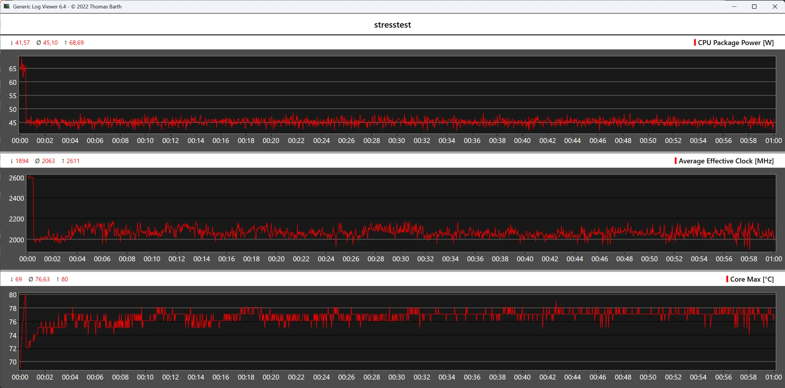 Im Stresstest erreicht der Intel Core Ultra X7 358H kurzfristig Temperaturen von bis zu 80 °C, was angesichts der von Intel freigegebenen Maximaltemperatur weiterhin unkritisch ist. Bei einer durchschnittlichen Leistungsaufnahme von rund 45 Watt pendelt sich die CPU-Temperatur anschließend bei etwa 76 °C ein. Etwas heißer wurde das SoC allerdings beim Cinebench-R15-Multi-Test (97 °C).
