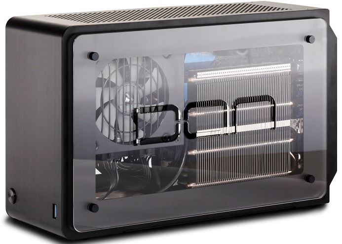 Das nur 33 x 21 x 11 Zentimeter messende Gehäuse bietet Platz für ein (Thin) Mini-ITX-Mainboard und einen bis zu 4,8 Zentimeter hohen CPU-Kühler. Da die vertikal montierte Grafikkarte maximal 30,6 Millimeter groß sein darf, lassen sich auch vergleichsweise potente Gaming-Systeme realisieren. Mit den optionalen Seitenfenster dürfen der CPU-Lüfter und die Speichermodule zudem ein wenig höher sein.