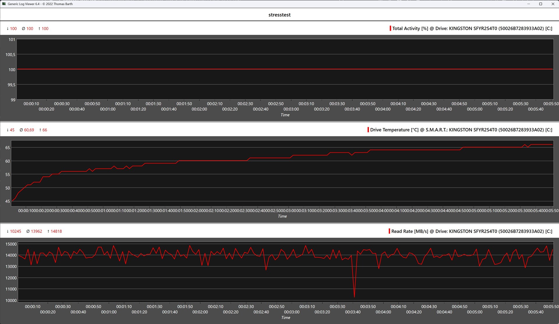 Auch im Diskspd-Loop-Test überzeugt die SSD mit relativ konstant hoher Leistung. Dennoch sehen wir einige geringere Leistungseinbrüche, die jedoch über den gesamten Testzeitraum hinweg nicht signifikant einbrechen. Mit durchschnittlich über 14.000 MB/s liefert die Kingston Fury Renegade G5 SSD eine hervorragende Leistung unter Dauerbelastung. Die Voraussetzung hierfür ist der Einsatz eines Kühlkörpers, welcher im Test in Kombination mit dem ASRock-Mainboard ausgezeichnet funktionierte. Wird die Kingston Fury Renegade G5 in einem Laptop oder einem Mini-PC verbaut, könnte es aufgrund der Hitze zu deutlich massiveren Leistungsverlusten unter Last kommen.