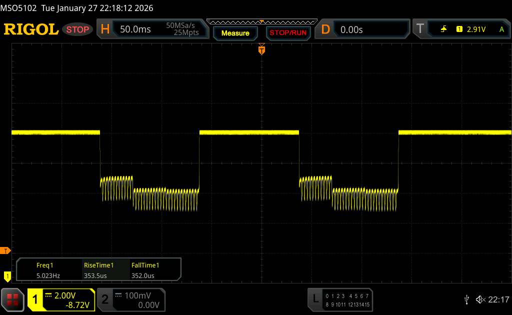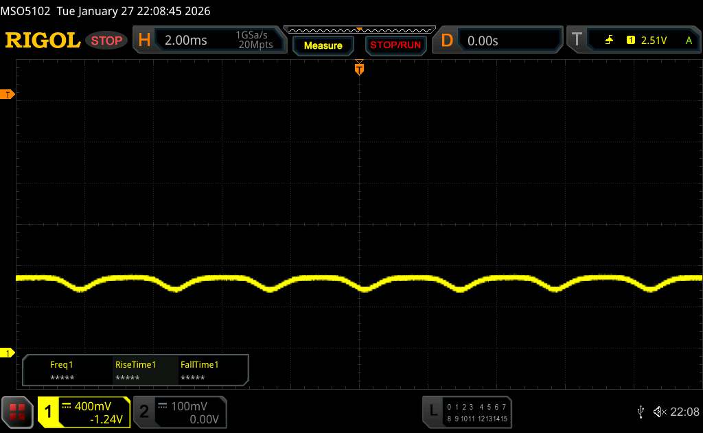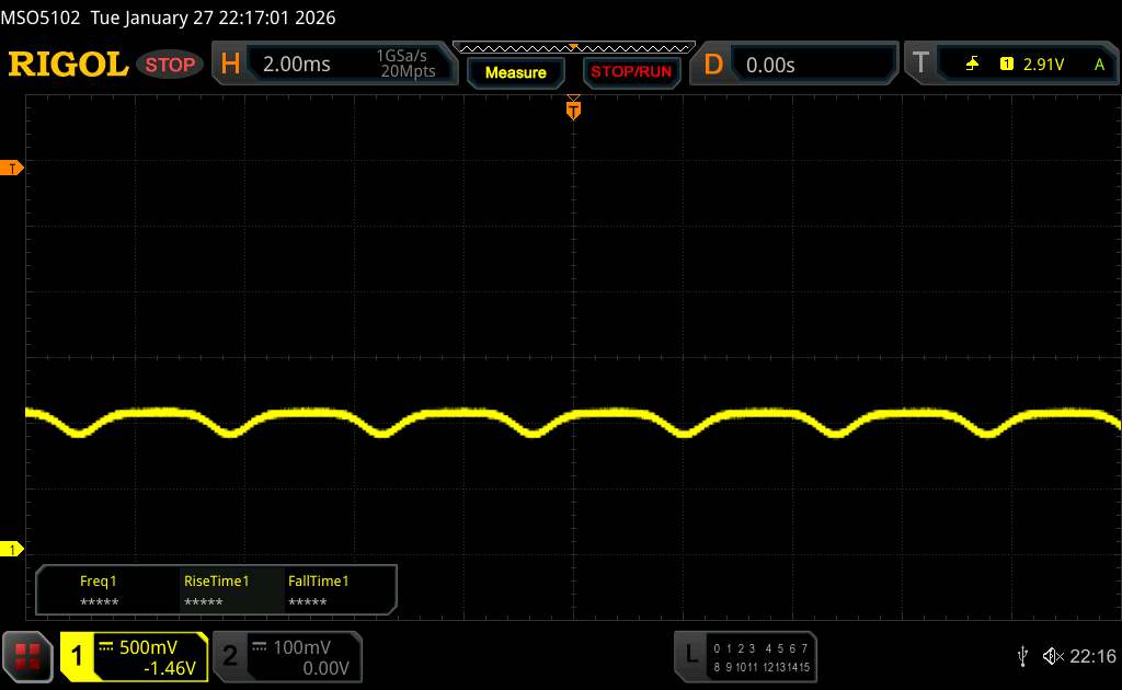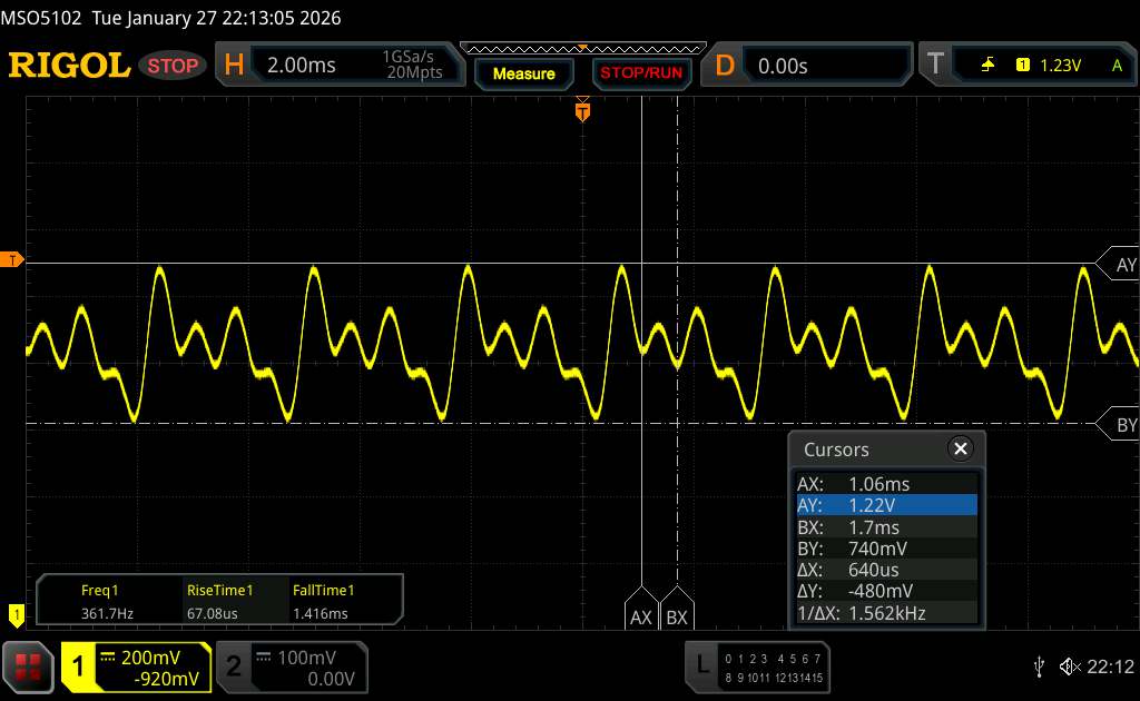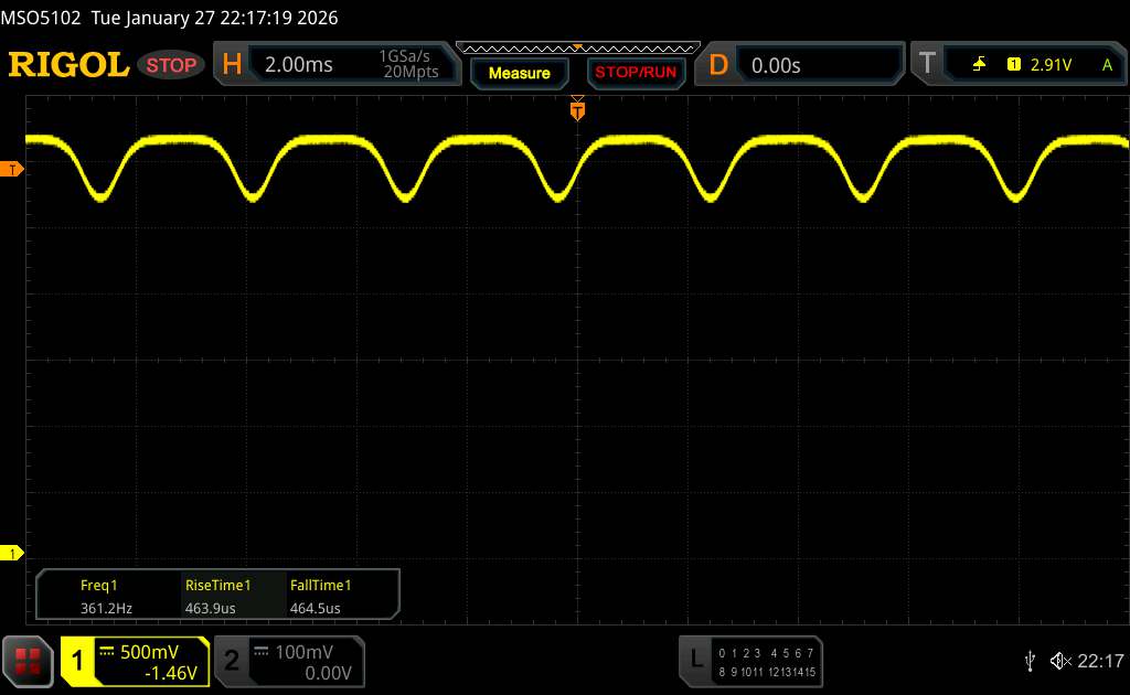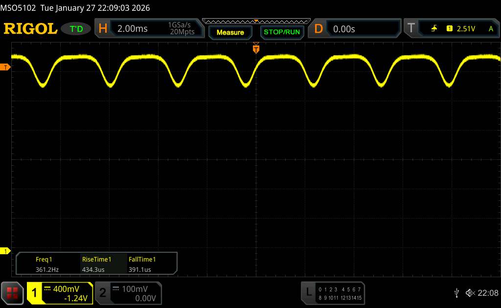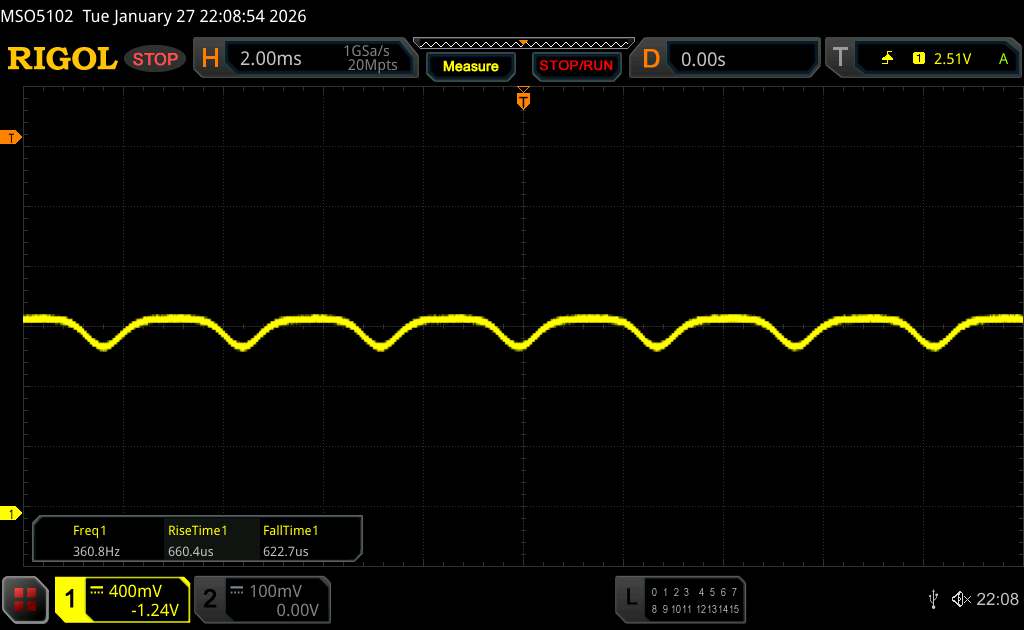 Mit dem Oszilloskop messen wir eine Grundfrequenz von 360 Hz. Allerdings kommt auch ein hochfrequentes PWM-Dimming von über 1.500 Hz zum Einsatz, sodass sich gesundheitliche Probleme von empfindlichen Menschen in Grenzen halten sollten.