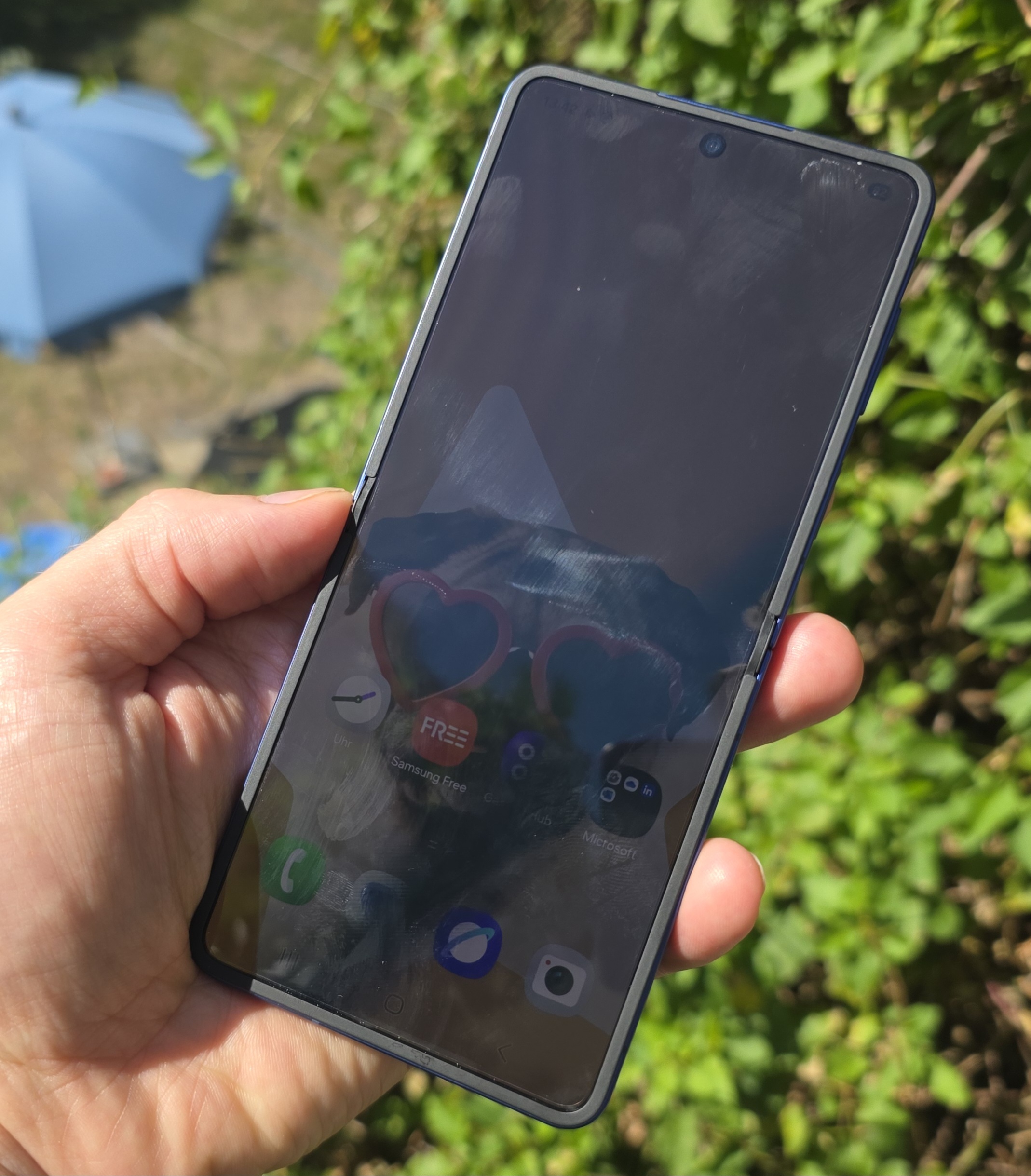 Bei den Kameras hat sich kaum etwas verändert im Vergleich zum Flip 6, die Optik auf der Innenseite des Flip 7 ist sogar nominell etwas schlechter, da der Sensor minimal kleiner geworden ist. Die 10-MPix-Kamera samt Fixfokus sorgt bei Tageslicht für solide Aufnahmen und Videos in 4K60. Selfies lassen sich ansehnlicher über die Hauptkamera erstellen, dabei dient das Außendisplay als Sucher.