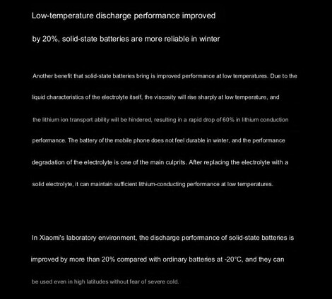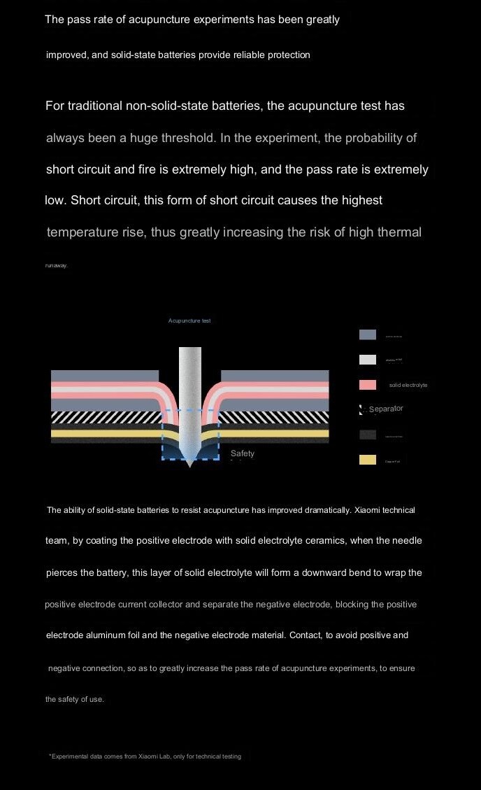Zudem verspricht Xiaomi für die Zukunft auch noch weitere Vorteile dieser Akkutechnik, etwa eine höhere Leistung bei niedrigen Temperaturen. Selbst bei -20 Grad Celsius sollen 20 Prozent mehr Leistung drin sein als bei traditionellen Batterien, zudem erhöht sich die Sicherheit dramatisch, weil die Wahrscheinlichkeit von Kurzschlüssen und Bränden stark reduziert sei, wie etwa auch Tests zeigen, bei denen die Akkus mit Nadeln penetriert werden. Trotz all dieser Vorteile ist zu beachten, dass es wohl noch einige Jahren dauern wird, bis wir in Xiaomi-Phone oder Xiaomi-Auto mit Solid State Batterien im Laden sehen werden.
