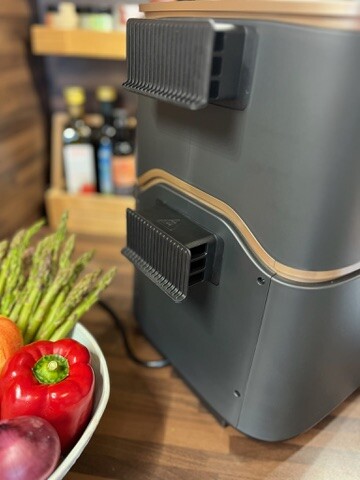 Der Cosori-Küchenhelfer lässt sich dank Griffmulden unten gut heben, dennoch würde ich das 10kg-Teil an einen fixen Platz in der Küche stellen. Abstandshalter hinten am Gerät sorgen für genügend Platz für die Abluft. Große Abmessungen (ca.40x30x40) bedeuten auch großes Volumen, was man mit den zwei Körben mit 4,3l oben bzw. 6,5l unten bestätigen kann. Seitens Leistung werden vom Hersteller bis zu 2.630 Watt angegeben.