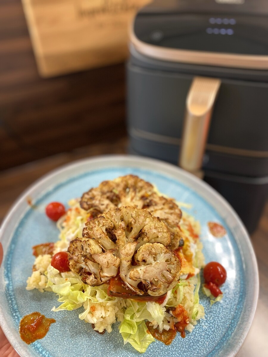 Für mein zweites Gericht testete ich Zucchinistücke in der oberen und zeitversetzt Karfiolsteaks in der unteren Garzone. Die Sync-Funktion kam hier nicht zum Einsatz, da ich die Zucchini vorher fertig haben wollte, um aus ihnen eine indische scharfe Tomaten-Zucchini-Sauce herzustellen auf die später das Karfiolsteak platziert wurde. Beide Gemüsesorten waren gar und noch knackig - für mich perfekt.