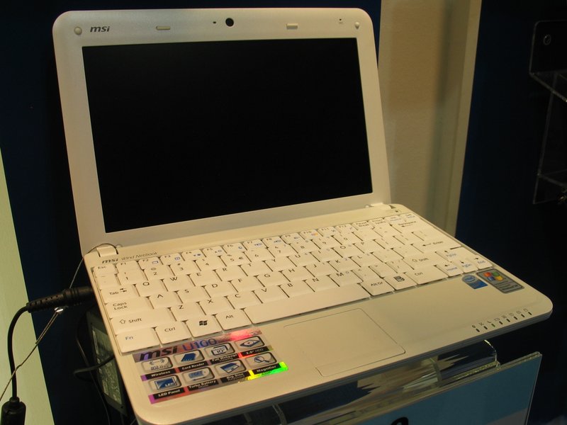 Ein paar interessante Sachen entdeckten wir auch heute wieder am... Überraschung: MSI-Stand. Gezeigt wurde beispielsweise die aktuelle bzw. kommende Palette des MSI Wind Netbooks. Die Einstiegsvariante bildet auch in Zukunft der U100, ausgestattet mit Intel Atom N270 CPU, Intel 945 GSE Chipsatz und dem obligaten 10-Zoll Display mit einer Auflösung von 1024x768 Pixel. Mit der matten Displaybeschichtung bleibt MSI auch dem ursprünglichen Gedanken des ersten Winds treu, und setzt weiterhin mehr auf Praxistauglichkeit denn Optik.