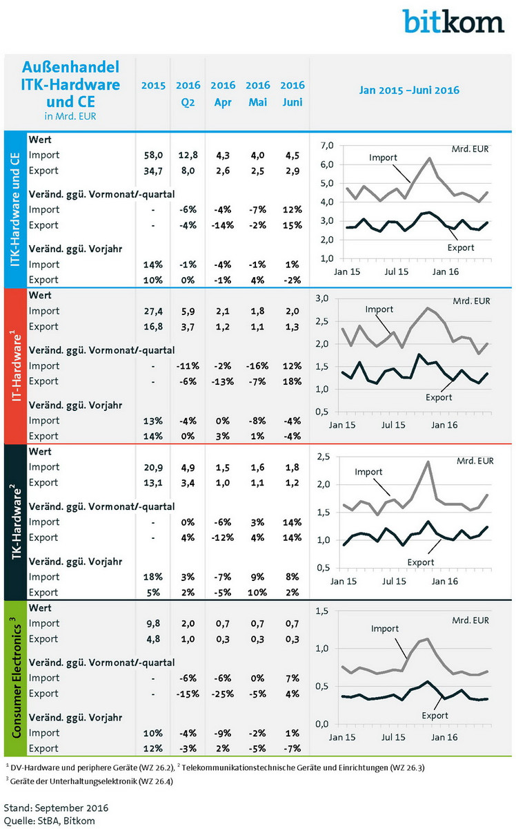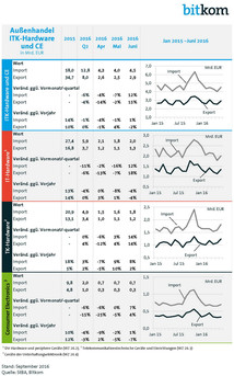 Der Export von Kommunikationstechnik verzeichnete im ersten Halbjahr 2016 in Deutschland ein deutliches Plus. Die Ausfuhr von Geräten, Netzwerktechnik und Telefonanlagen stieg um 2,8 Prozent auf 6,6 Milliarden Euro. Ebenso konnten die Verkäufe von Unterhaltungselektronik in das Ausland etwas zulegen. Die Umsätze wuchsen um 0,8 Prozent auf 2,1 Milliarden Euro. Der Export von IT-Hardware wie Computer, Drucker oder Zubehör verlor hingegen 3,2 Prozentpunkt und fiel auf 7,7 Milliarden Euro.