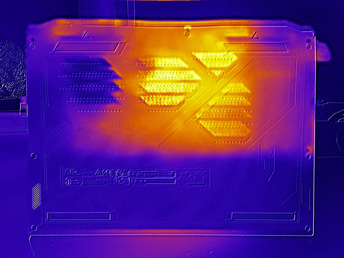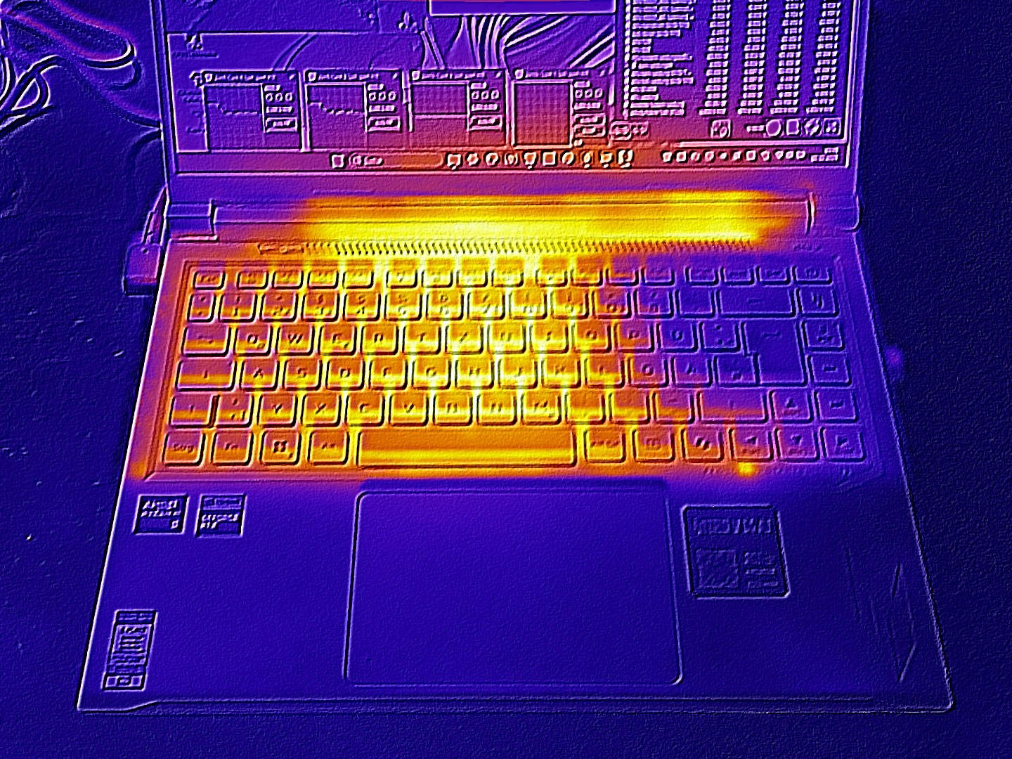 Der Gehäuseboden erwärmt sich wie bei vielen Laptops etwas stärker als die Oberseite. Im Stresstest konnten wir oben maximal 45 °C und unten maximal 51 °C messen, was recht hohen Werten entspricht, wobei einige Gegenspieler noch heißer werden (siehe Tabelle). Im Idle-Betrieb bleibt das gesamte Chassis kühler als 30 °C, wofür es Lob gibt.