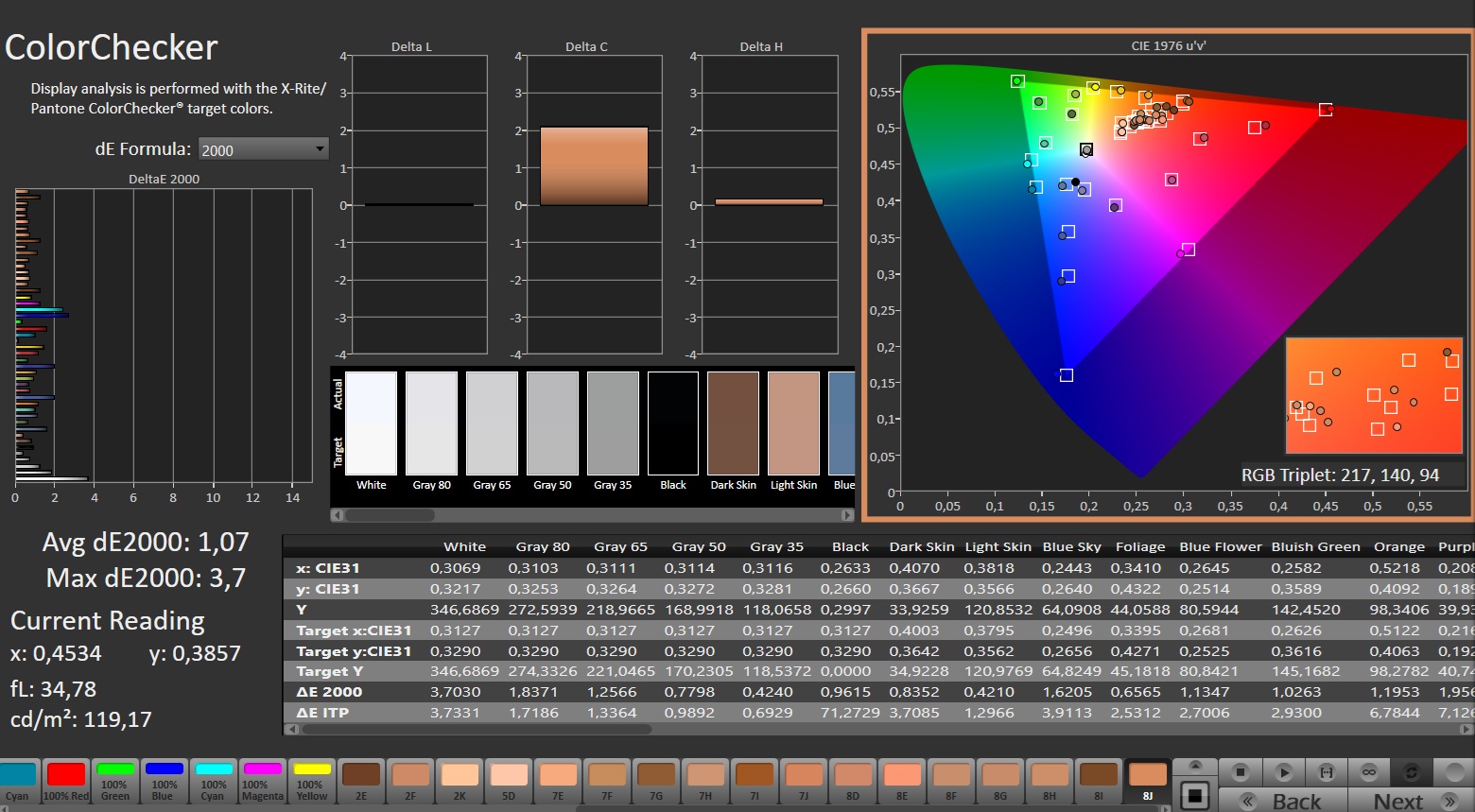 | Delta E Graustufen * | 1.2 | 5.4 -350% | 3.9 -225% | 1.9 -58% | 1.2 -0% | 3.5 -192% | 2.4 -100% |