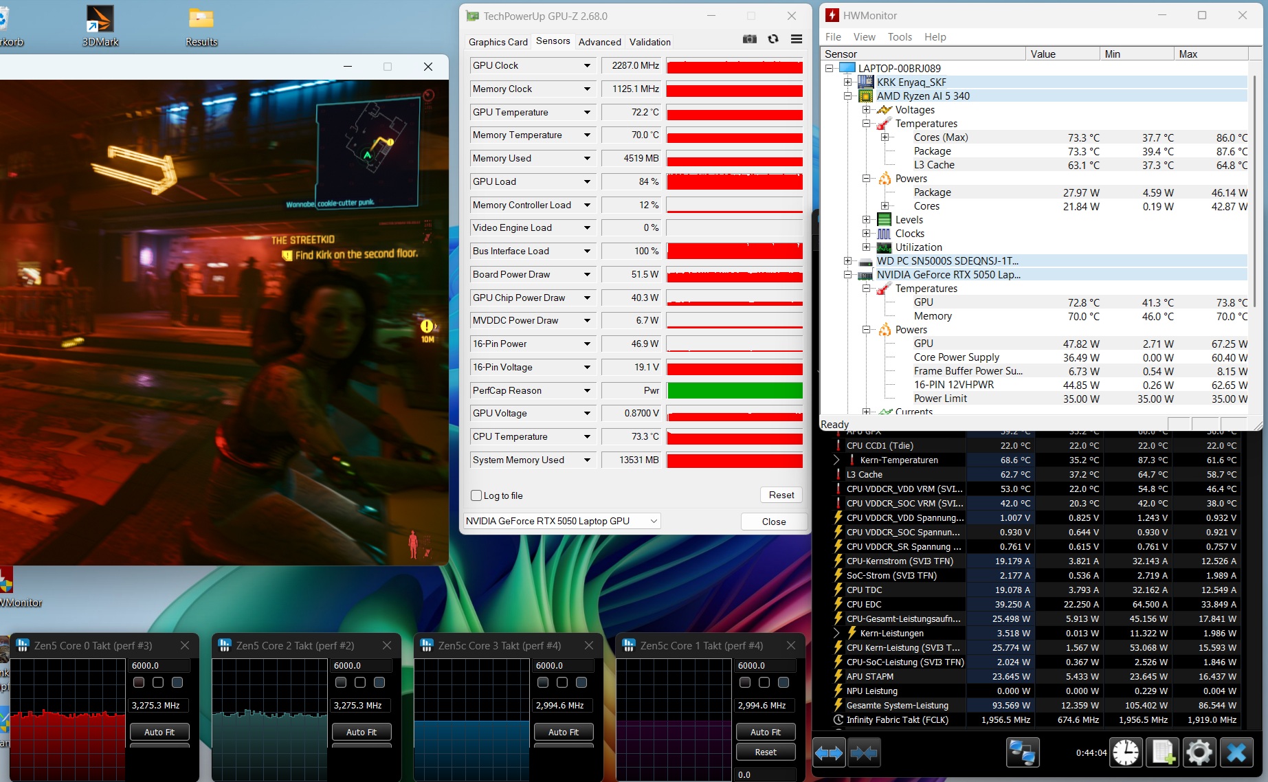 | Acer Nitro V14 AI ANV14-62-R9LT Ryzen AI 5 340, GeForce RTX 5050 Laptop, 76 Wh | Acer Nitro V 16 AI ANV16-42-R860 R5 240, GeForce RTX 5050 Laptop, 76 Wh | HP Victus 15-fa2160ng i5-13420H, GeForce RTX 5050 Laptop, 70 Wh | Lenovo LOQ 15AHP10 R7 250, GeForce RTX 5060 Laptop, 60 Wh | Lenovo Legion 5 15AHP G10 R7 260, GeForce RTX 5060 Laptop, 80 Wh | Schenker XMG Core 15 (M25) Ryzen AI 7 350, GeForce RTX 5060 Laptop, 99.8 Wh | Razer Blade 14 2025 Ryzen AI 9 365, GeForce RTX 5070 Laptop, 72 Wh | Durchschnitt der Klasse Gaming | |