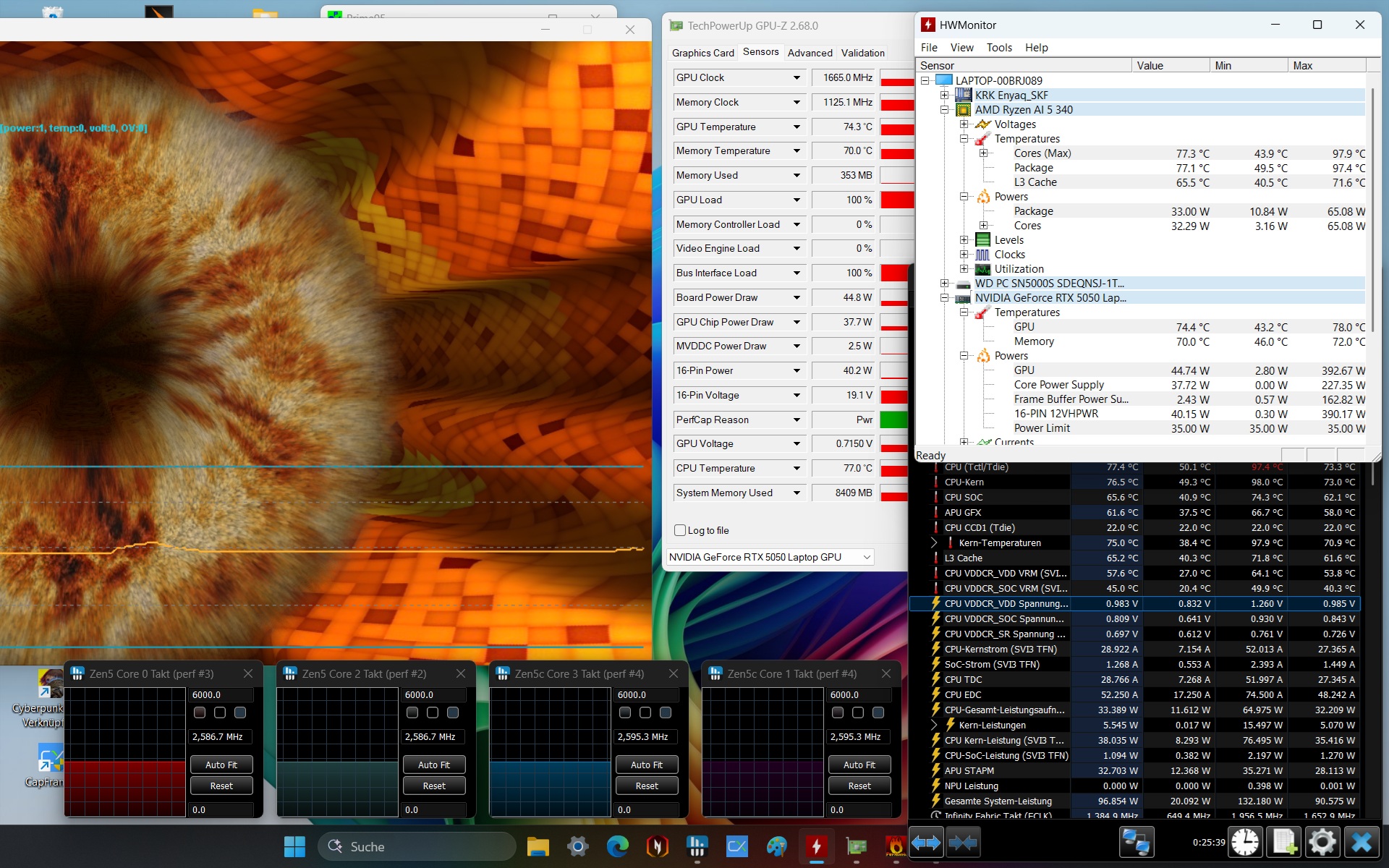 Keine Höchstleistungen darf man auch bei Performance erwarten. Da die TGP der verbauten GeForce RTX 5050 auf 60 Watt limitiert ist, liegt die Grafikkarte etwas unter ihren Möglichkeiten. Im 3D-Betrieb und teilweise schon im Idle-Modus kann der 15-Zöller dennoch ziemlich laut werden, weshalb wir uns für den Nachfolger ein besseres/potenteres Kühlsystem respektive eine bessere Lüftersteuerung wünschen.