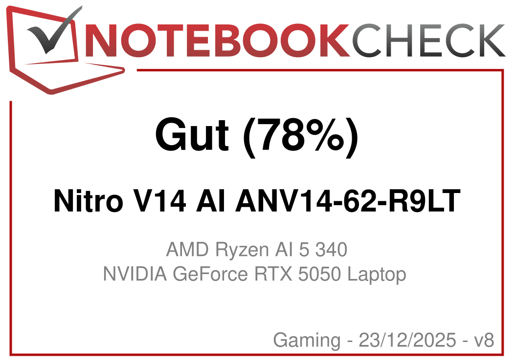 Apropos Konkurrenz: Zu den Gegenspielern des Nitro V14 AI zählen maximal 15 Zoll große Gaming-Laptops, die ebenfalls recht preiswert sind und eine RTX 5050 oder RTX 5060 enthalten, wie zum Beispiel das HP Victus 15 und das Lenovo LOQ 15. Darüber hinaus findet sich die aktuelle, aber auch teurere Mittelklasse-Referenz Lenovo Legion 5 in den Vergleichstabellen sowie das ebenfalls kostspieligere XMG Core 15. 14-Zoll-Laptops mit RTX 5000er-GPU wurden von uns bisher kaum getestet, Ausnahmen bilden hier das Razer Blade 14 und das Asus ROG Zephyrus G14 mit der deutlich stärkeren RTX 5070 bzw. RTX 5070 Ti.