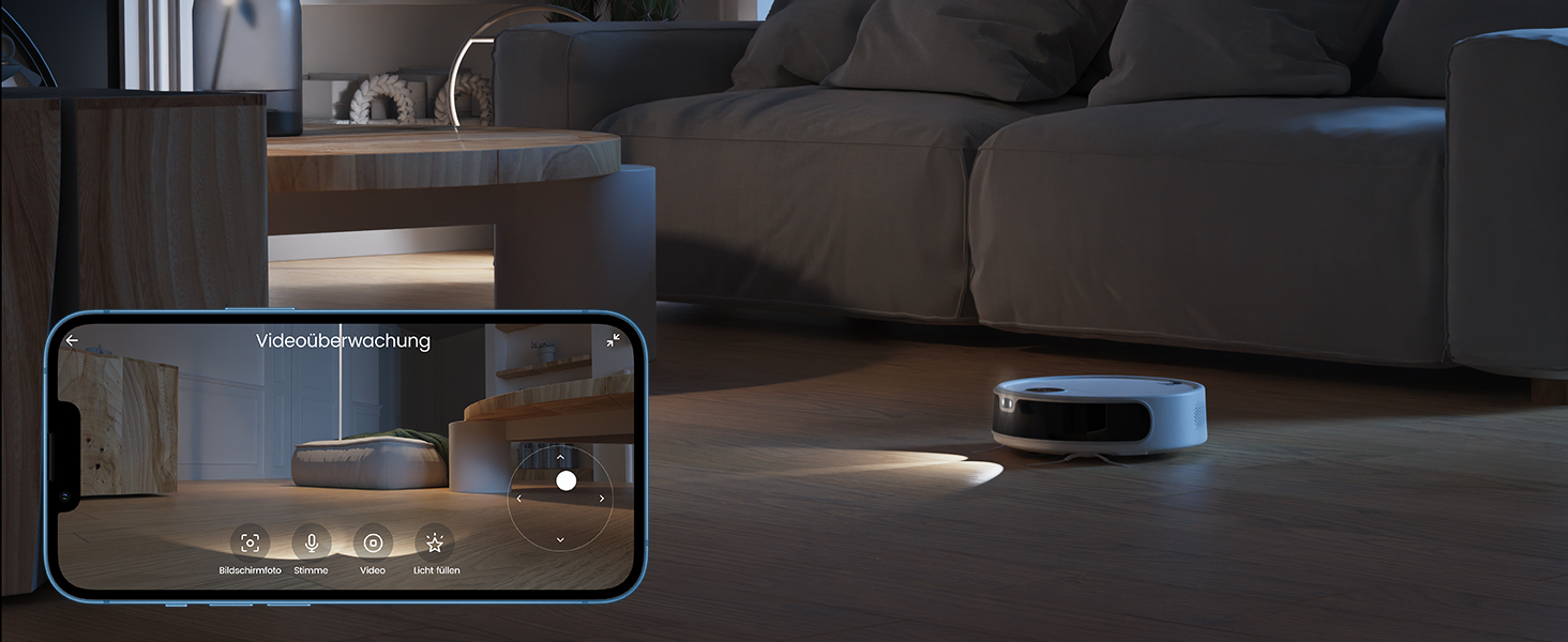 Ebenfalls an Bord ist eine Kamera samt Zwei-Wege-Audio und Nachtlicht in der Front. Dessen eingefangenes Bild lässt sich über die App des Saugroboters live abrufen, wobei der Roboter hierbei auch manuell durchs Zuhause manövriert werden kann. So kann man auch von unterwegs schauen, ob zuhause alles in Ordnung ist und Haustiere und Co im Blick behalten. Alternativ zur App-Steuerung ist der Lefant P1 auch mit Amazon Alexa und Google Assistant kompatibel. Und er hat auf der Oberseite ein kleines Display mit einem putzigen Gesicht, dass über den Status des Gerätes informiert.