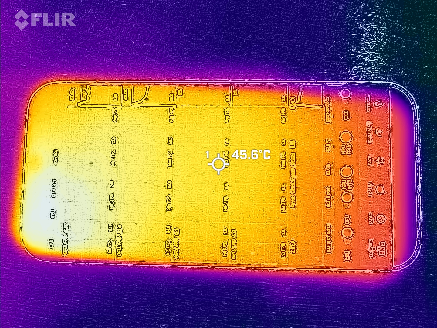 (-) Auf der Unterseite messen wir eine maximalen Wert von 50.1 °C (im Vergleich zum Durchschnitt von 34 °C).