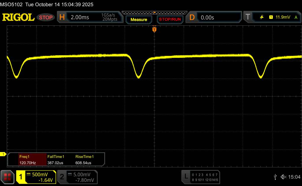 Zur Regelung der Leuchtkraft nutzt Xiaomi OLED-typisch PWM mit einer laut Datenblatt hohen Frequenz von 2.160Hz. Wir messen ein Grundflackern von etwa 120 Hz. Der Amplitudenverlauf ist bei unserer Messung mit dem Oszilloskop über das gesamte Helligkeitsspektrum gleichmäßig. Neu ist, dass ein Wechsel zwischen DC- und PWM-Dimming möglich ist.