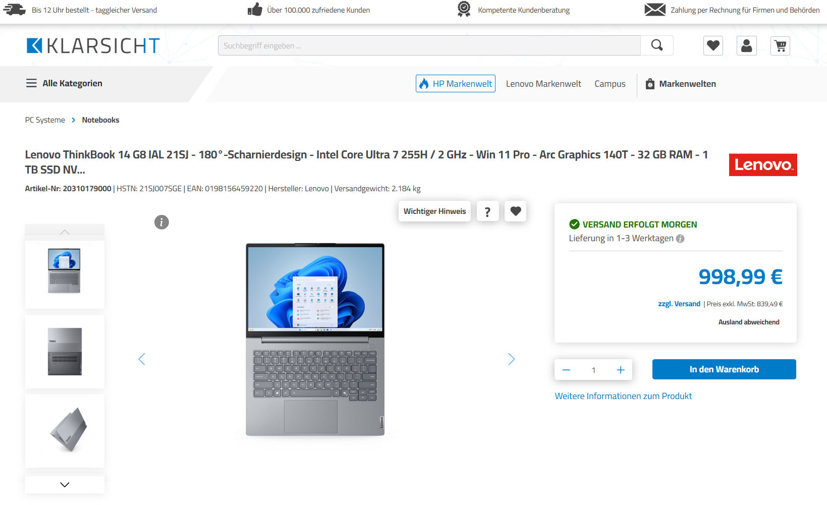 Die ThinkBook-Reihe zählt innerhalb des Lenovo-Sortiments zum Business-Segment, die Modelle der Serie richten sich aber auch an Privatkunden. Aktuell führen Klarsicht-IT.de und Notebookstore.de mit dem Lenovo ThinkBook 14 G8 IAL 21SJ007SGE ein sehr gut ausgestattetes 14-Zoll-Modell der Reihe zu einem Preis von 998,99 Euro bzw. 999 Euro im Sortiment. Der Rechner ergatterte in unserem Test die Bewertung "Gut (84 %)".