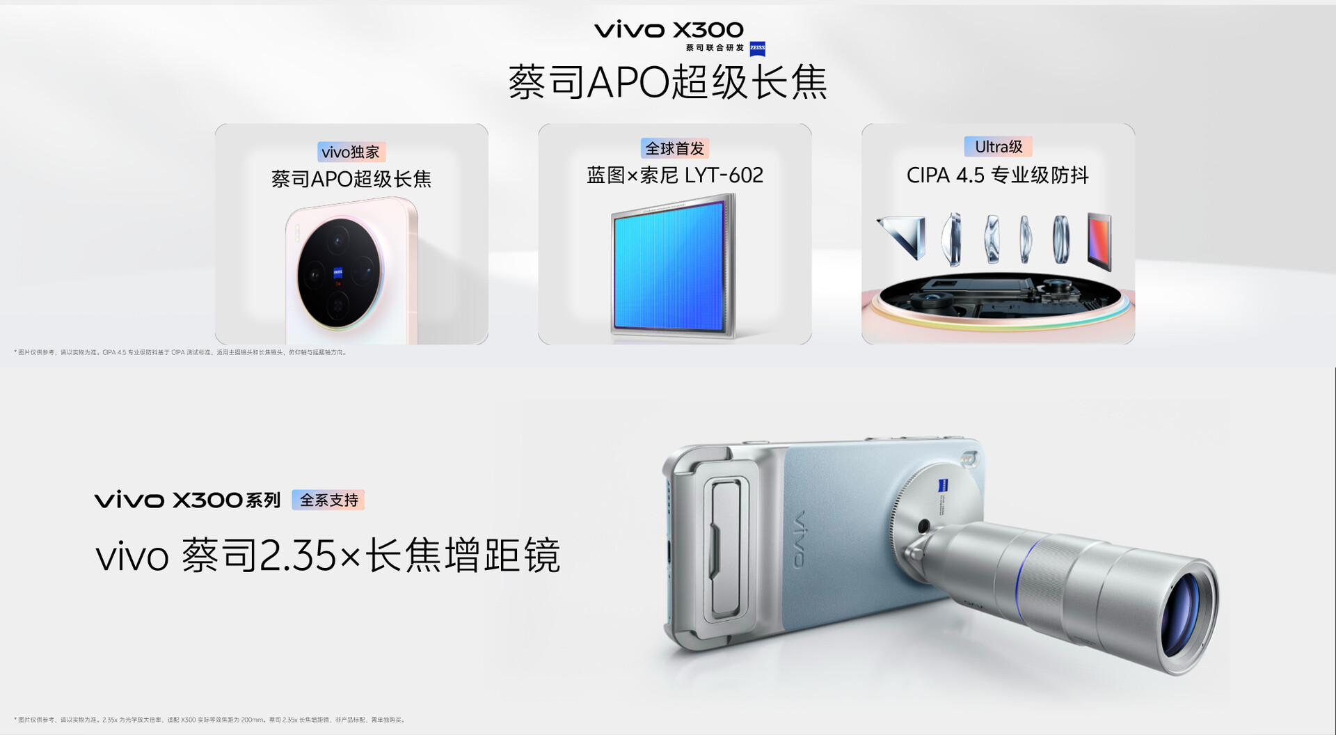 Das Vivo X300 soll die Konkurrenz vor allem durch eine starke Kamera-Ausstattung übertreffen, wofür Vivo eine 50 Megapixel Selfie-Kamera, eine 50 MP Ultraweitwinkel-Kamera und eine 200 Megapixel Hauptkamera mit 1/1,4 Zoll Sensor verbaut. Das Tele-Kamera-Setup ist interessant, denn Vivo bietet Nutzern zwei unterschiedliche Optionen an. Erstens eine 50 MP Periskop-Tele-Kamera mit Sony LYT-602 Sensor im 1/1,95 Zoll Format und dreifachem optischen Zoom, und zweitens einen Zeiss-Telekonverter, der die Hauptkamera in eine Tele-Kamera mit 2,35-fachem Zoom verwandelt, mit dem klobigen Aufsteck-Objektiv passt das Smartphone aber auch nicht mehr in die Hosentasche.
