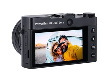 Auf der Rückseite der Rollei Powerflex X8 Dual Lens verbirgt sich ein Feature, das man bei einer Kompaktkamera nicht erwarten würde: eine Selfie-Kamera. Während viele Kameras ein ausklappbares Display nutzen, damit Nutzer komfortabel Selfies aufnehmen können, verbaut Rollei kurzerhand eine zweite Kamera, die allerdings nur mit einem winzigen 1/3,06 Zoll Sensor ausgestattet ist.