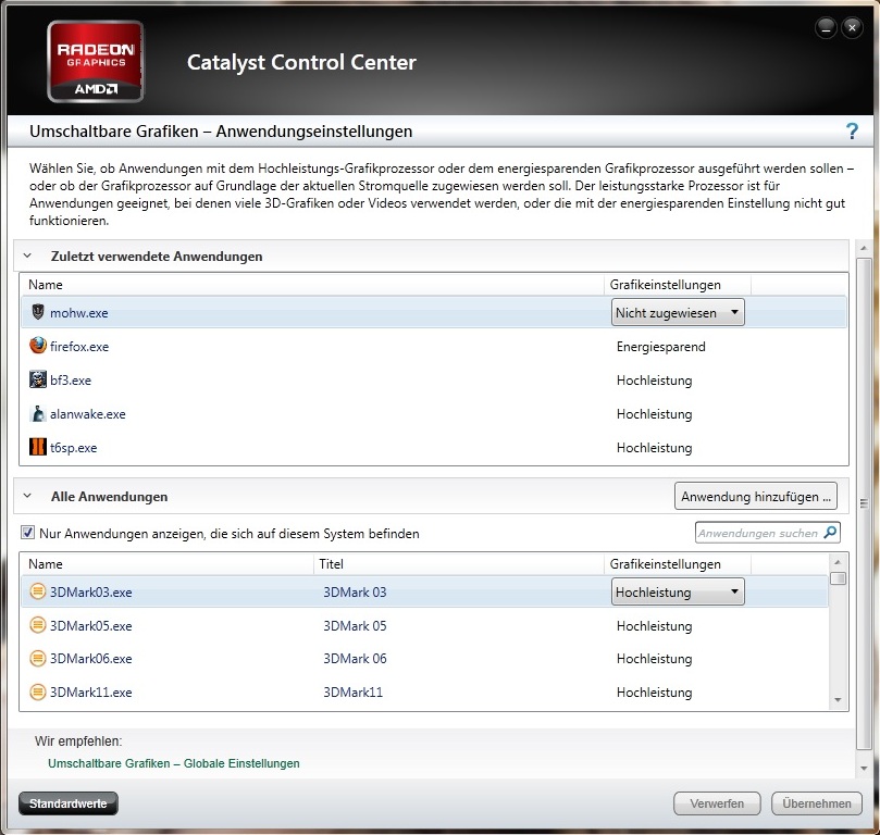 Das Menü »Umschaltbare Grafiken – Anwendungseinstellungen« offenbart weitere Optionen. Neben den installierten Programmen werden hier auch alle kürzlich geöffneten Anwendungen gelistet. Per simplem Mausklick kann man jedem Programm die gewünschte GPU zuordnen (Höchstleistung = Radeon HD 7970M, Energiesparend = HD Graphics 4000). Das alte Menü listete nur einen Teil der Anwendungen und vergaß manchmal getroffene Einstellungen.