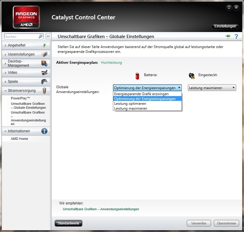 Über fehlende Einstellungsmöglichkeiten können wir uns beispielsweise nicht mehr beklagen. Im Catalyst Control Center findet sich unter »Umschaltbare Grafiken – Globale Einstellungen« endlich ein Menü, in dem der Nutzer das globale Setting ändern darf – getrennt für den Akku- und den Netz-Betrieb. Wegen der vergleichsweise schlechten Spiele-Erkennungsrate (im Test wurden etwa 50 % der Titel nicht automatisch der Radeon HD 7970M zugewiesen) lohnt es sich für Hardcore-Gamer, die Option generell auf »Leistung maximieren« zu stellen. Alle 3D-Programme werden dann zuverlässig mit der dedizierten GPU gestartet.