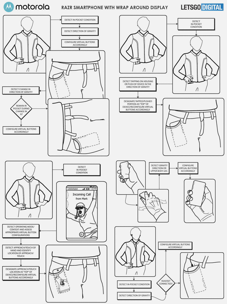 Die Benutzeroberfläche passt sich automatisch daran an, wie das Gerät vom Nutzer gehalten wird. Auf Wunsch können virtuelle Buttons an den Seiten eingeblendet werden, die es unter anderem ermöglichen sollen, die Lautstärke der Musikwiedergabe zu steuern, ohne das Smartphone aus der Hosentasche nehmen zu müssen. Wie üblich bedeutet ein Patent aber nicht, dass Motorola tatsächlich plant, ein solches Smartphone auf den Markt zu bringen.