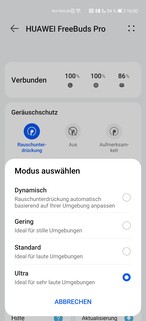 Den üppigsten Leistungsumfang können erwartungsgemäß die FreeBuds Pro vorweisen. Vor allem bei der Aufnahmequalität der Mikrofone (bis 20 kHz) setzen sie sich von den beiden kleineren Modellen ab. Die aktive Geräuschunterdrückung ist in drei Stufen einstellbar oder kann dynamisch vom System anhand der Umgebungsgeräusche geregelt werden. Ebenso bleibt der Passtest für die Aufsätze dem Pro-Modell vorbehalten.