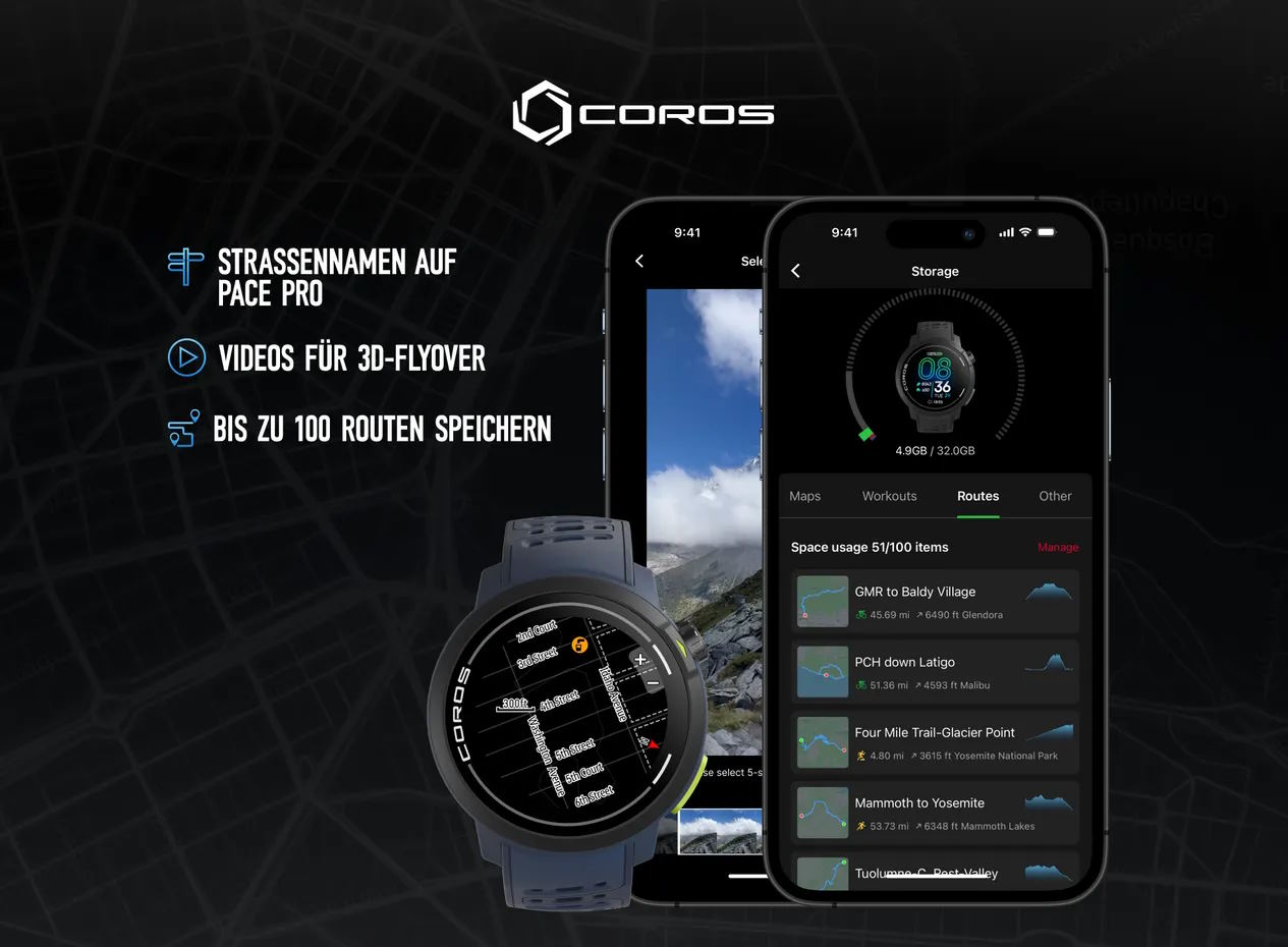 Mit dem September-Update lassen sich nun bis zu 100 Routen auf den Smartwatches speichern, zudem gibt es weitere Sport-Modi. Dazu kommen noch weitere Änderungen, so lassen sich in Multisport-Einheiten inzwischen auch Krafteinheiten erfassen, Verbesserungen hat es Herstellerangaben zufolge auch beim Kalender, dem Musik- und Podcast-Playern gegeben, bei der Coros Nomad lässt sich bei Freiwasseraktivitäten jetzt die (maximale) Wassertiefe anzeigen.