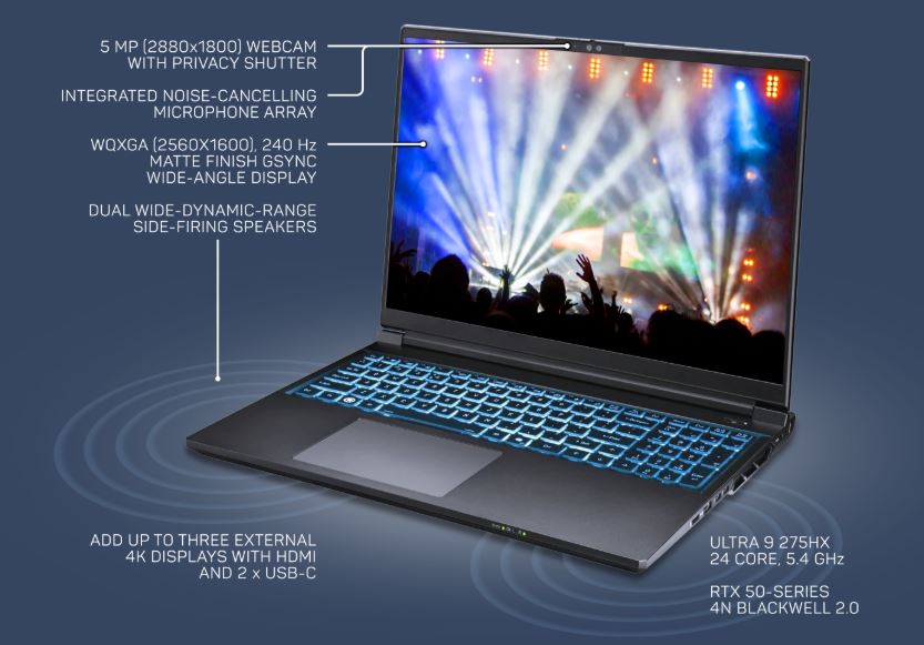 Verbaut sind eine mit 5 Megapixeln auflösende Kamera, ein Mikrofon-Array und zwei 2-Watt-Lautsprecher. Das 2,25 Kilogramm schwere Notebook kommt mit einem Akku mit einer Kapazität von 80 Wh, angegeben wird eine Laufzeit von bis zu vier Stunden bei Nutzung der iGPU und mit niedriger bis mittlerer Helligkeit. Als Einstiegspreis ruft der Hersteller 2.895 Dollar auf.