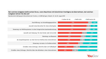 Weniger Probleme haben die Deutschen im Vergleich dazu mit autonomen Autos (52 Prozent). Am geringsten ist die Skepsis der Befragten bei der Vorstellung, dass einfachere Berichte, wie solche über ein Fußballspiel (45 Prozent Befürwortung) oder Aktienkurse, von künstlicher Intelligenz (49 Prozent Befürwortung) erstellt werden.