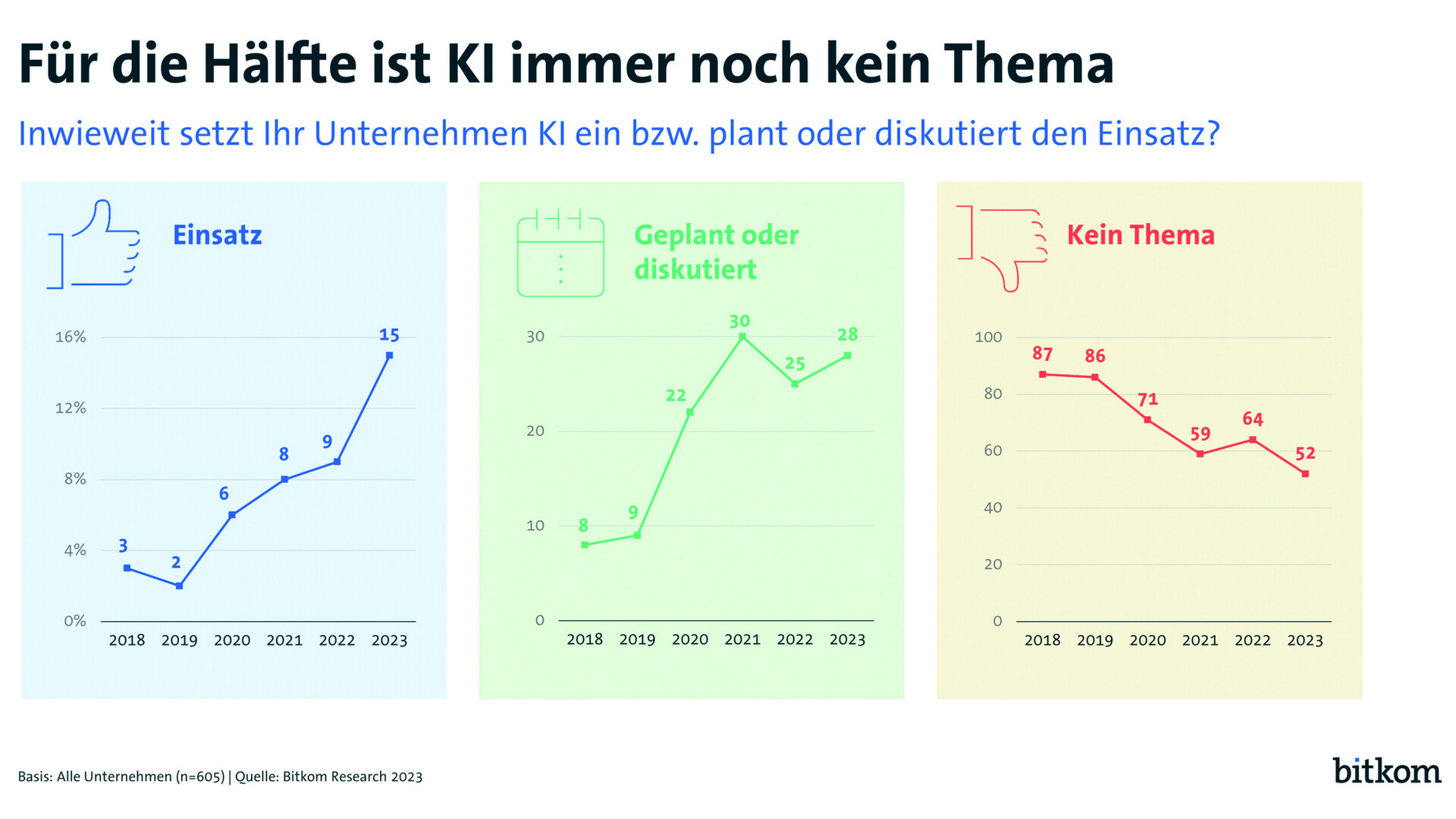Zum Big Data.AI Summit in Berlin hat der Branchenverband Bitkom einige spannende Zahlen zum Unternehmenseinsatz von Künstlicher Intelligenz (KI) in Deutschland enthüllt. Für die Hälfte der deutschen Firmen ist KI noch immer kein Thema, die große Mehrheit der Unternehmen lässt ChatGPT und Co. derzeit noch links liegen. Aber: Der Anteil der Unternehmen, die KI einsetzen, stiegt innerhalb eines Jahres von 9 auf 15 Prozent. Zwei Drittel sehen KI als wichtigste Zukunftstechnologie an.