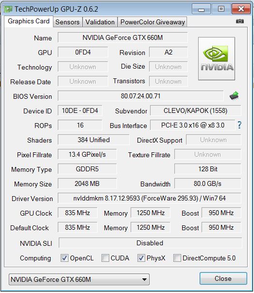 Das Schenker A722 kommt mit den gleichen Grafikchips wie das One K73-SO. Die alltäglichen Aufgaben erledigt der Intel HD Graphics 4000 Chip, die leistungshungrigen Anwendungen wie Computerspiele bearbeitet der Nvidia GeForce GTX 660M. Der GeForce GTX 660M ist ein Vertretrer der oberen GPU-Mittelklasse. Die GPU unterstützt DirectX 11.1 und arbeitet mit einer Basisgeschwindigkeit von 835 MHz. Die Geschwindigkeit kann auf bis zu 950 MHz erhöht werden.