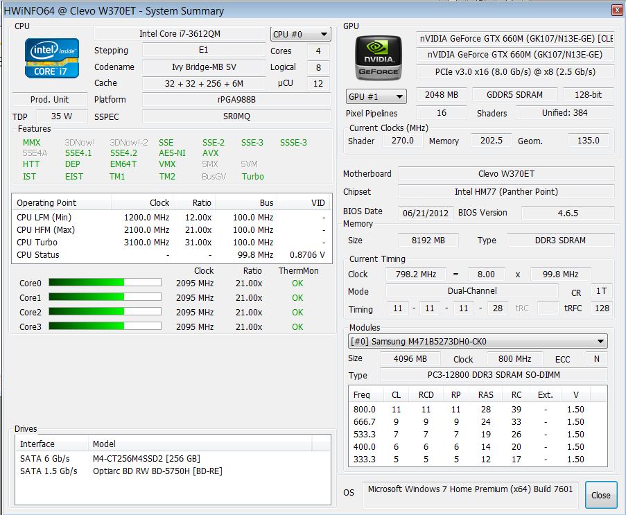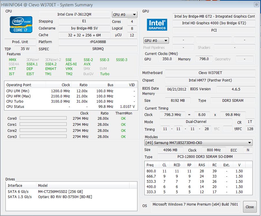 Unser Testgerät enthält einen Intel Vierkernprozessor (Intel Core i7-3612QM). Der Prozessor entstammt Intels aktueller Ivy-Bridge-Prozessorgeneration. Die Arbeitsgeschwindigkeit der CPU liegt bei 2,1 GHz. Die Geschwindigkeit kann auf 2,8 GHz für alle vier Kerne, auf 3 GHz für 2 Kerne bzw. 3,1 GHz für einen Kern erhöht werden. Die dahinterstehende Technik trägt die Bezeichnung "Intel Turbo Boost". Die Beschleunigung der CPU-Kerne verläuft automatisch. Der Core i7-3612QM besitzt eine TDP von nur 35 Watt. Die TDP des Intel Core i7-3610QM (One K73-SO) liegt vergleichsweise bei 45 Watt.