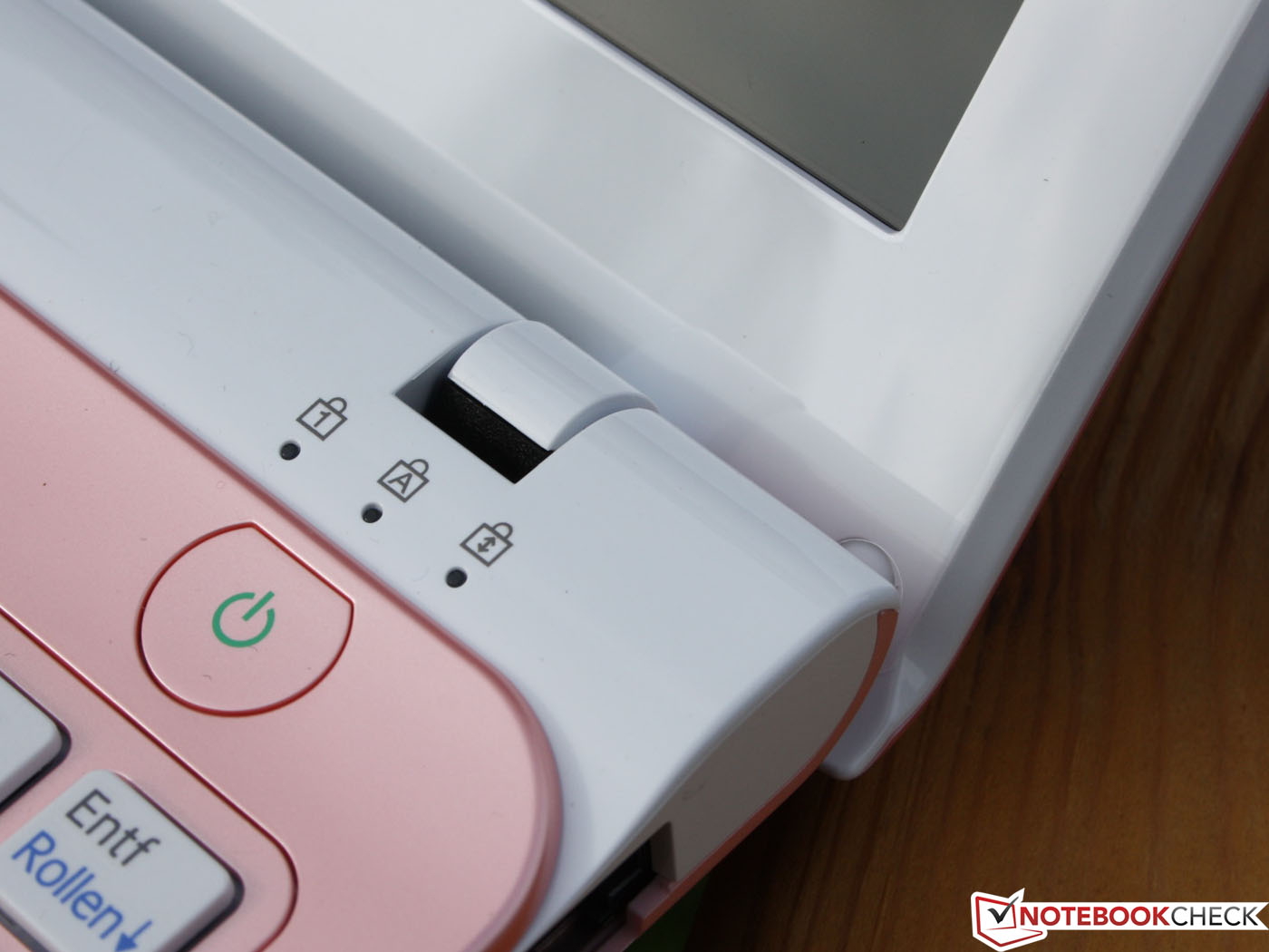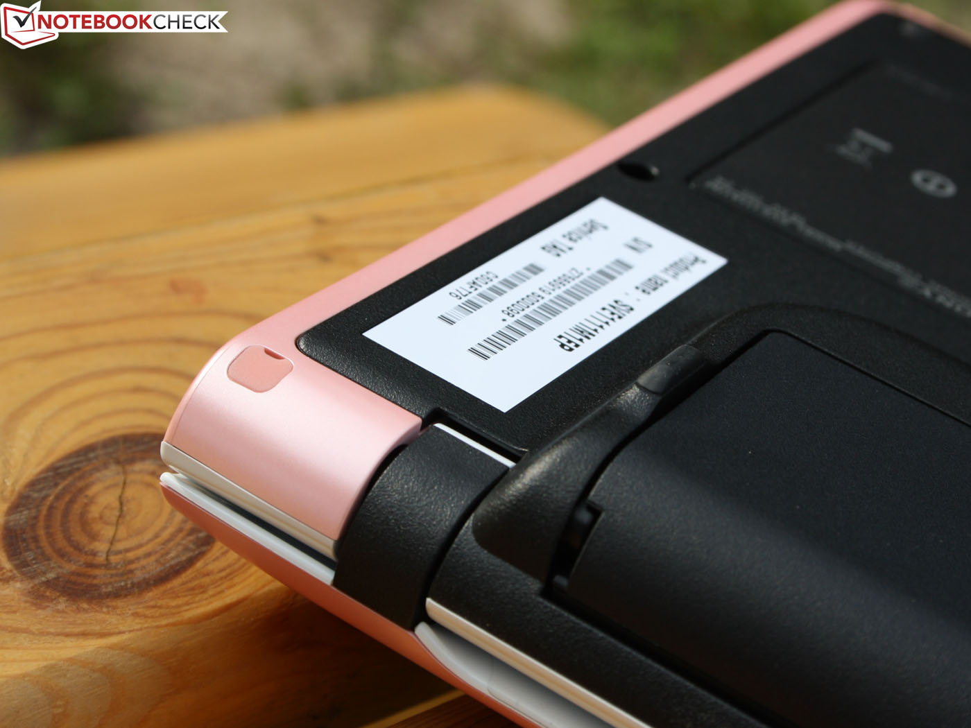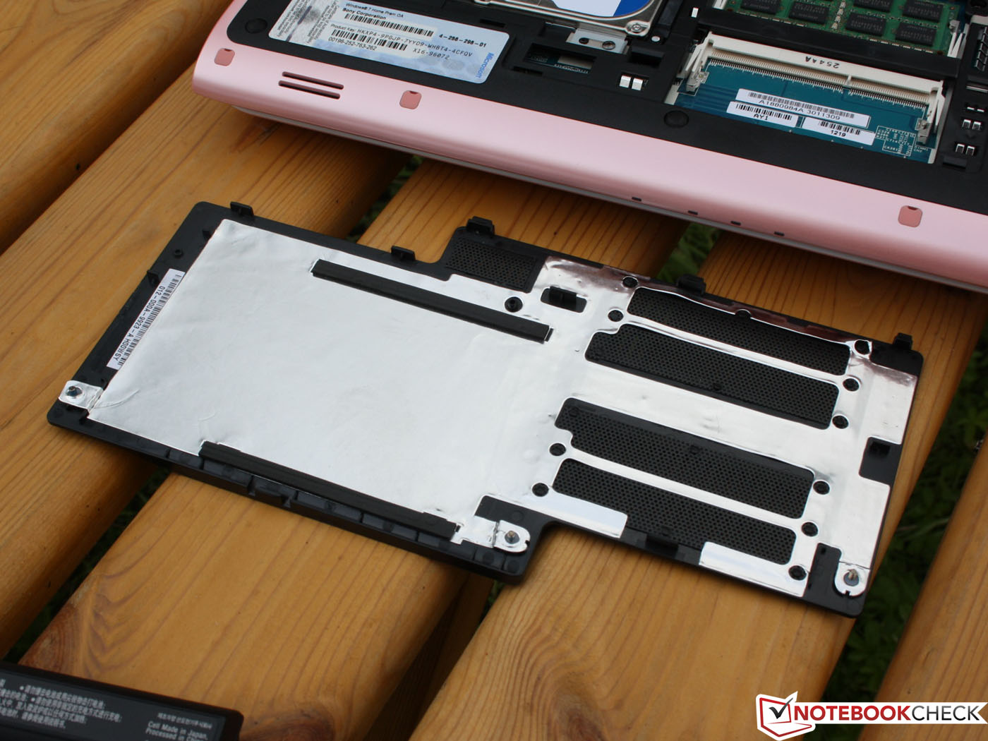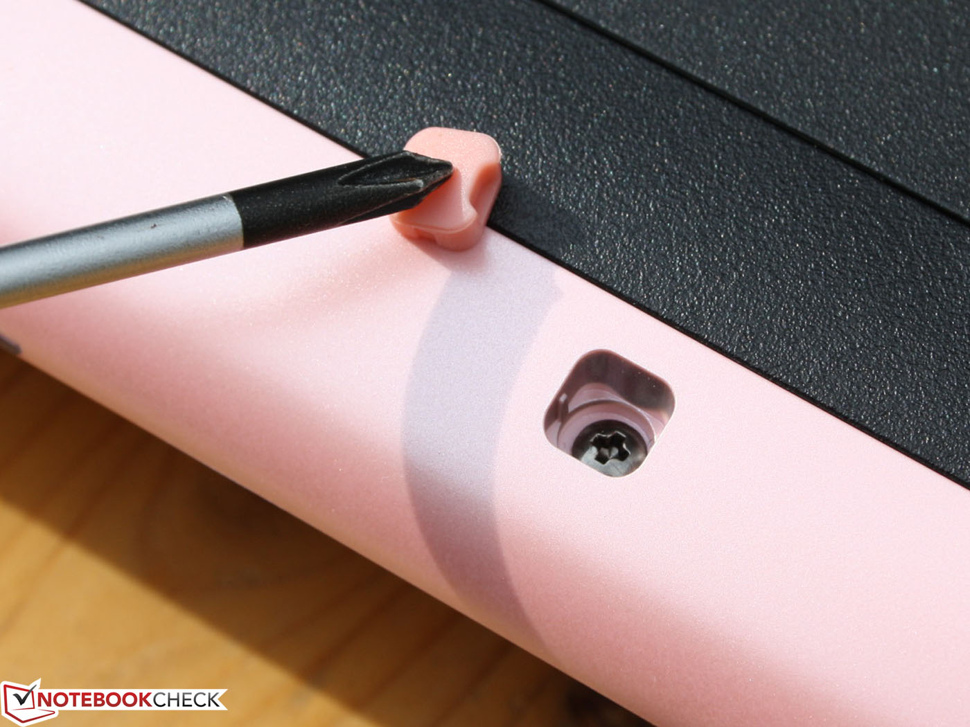 Hochglänzende Schmierflächen gibt es nur wenige, nämlich die Bereiche im edlen Weiß. Die Flächen, die pink gestaltet sind, negieren Fingerabdrücke vorbildlich und wird von uns subjektiv wahrgenommen als angenehme Mischung aus stumpf und glatt. Die Bodenplatte hat eine große Öffnung für RAM (zwei Sockel) und die 2,5-Zoll-HDD.