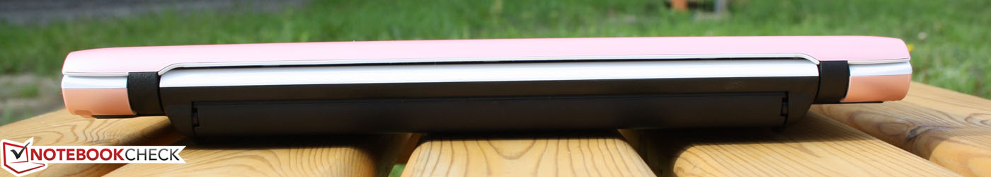 Das an sich hübsche Notebook leidet mangels Chassis-Stabilität an Wertigkeit, die Konstruktion ist biegsam. Das Clickpad hat einen zu geringen Hub, das kaum vorhandene Feedback stört uns. Trotz der geringen Leistung erwärmt sich das Gehäuse deutlich und bei Belastung kann der Lüfter richtig laut werden.